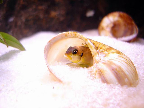 = Recommended care: A 65-75 cm aquarium, with a 3-5 cm sandy soil, and some suitable plants in the background. There should be present some snailshells in the sand. Fish use these snailshells as a hiding places. They also build their territorium around it. Gold ocellatus can be kept in a community tank with small and peaceful cichlids. Peronally, I think it would look nice if they're kept in a species tank.