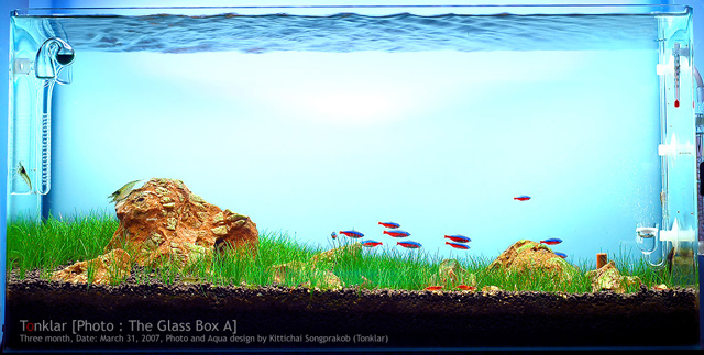 Aqua Glass Box description. Tank Size : 23" x 10" x 12" Volume :45L Plants : Hair glass Fish/Animals : Cardinal tetra , Caridina japonica (Yamoto Shrimp or Amano Shrimp), Neocaridina denticulata, (Red Cherry Shrimp), Otocinclus affinis Substrate: Aqua Soil-Amazonia - Power Sand Special S