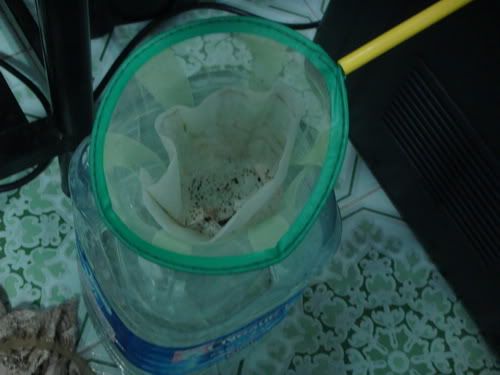ถังน้ำ 6 ลิตร ตัดปลายปากถังให้ ที่ช้อนปลา หล่อนลงไปได้ ข้างใน ฮั่นแน่ กระดาษกรองกาแฟ กินแม่งอยู่ทุกวันไม่เคยนึกวันนี้เอาหละวะ เอามาอันนึง ขนาดผงกาแฟยังลงไม่ได้ ไอ้แมลงน้ำ มึงติดอยู่ที่นี่แหละ [on_026]