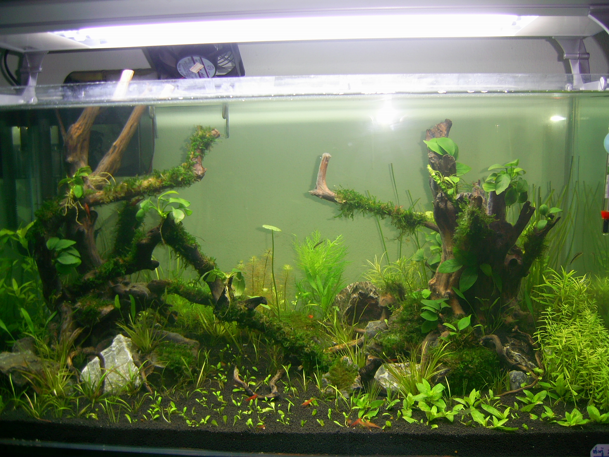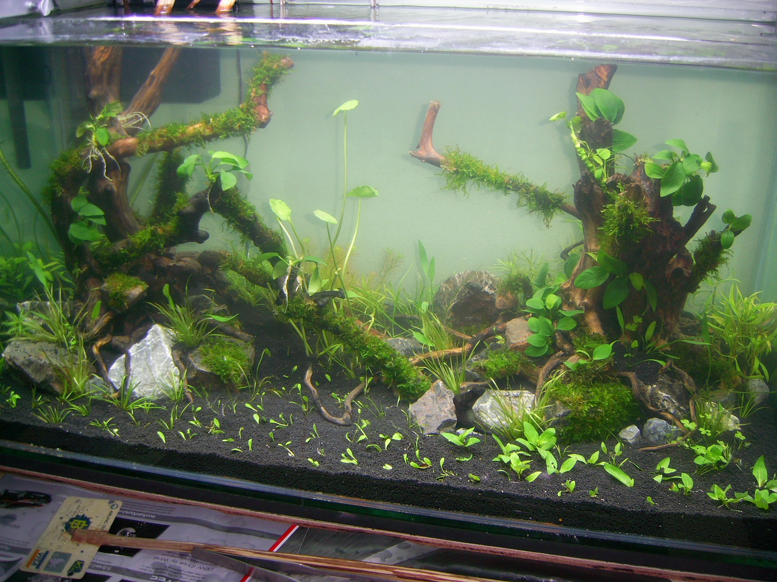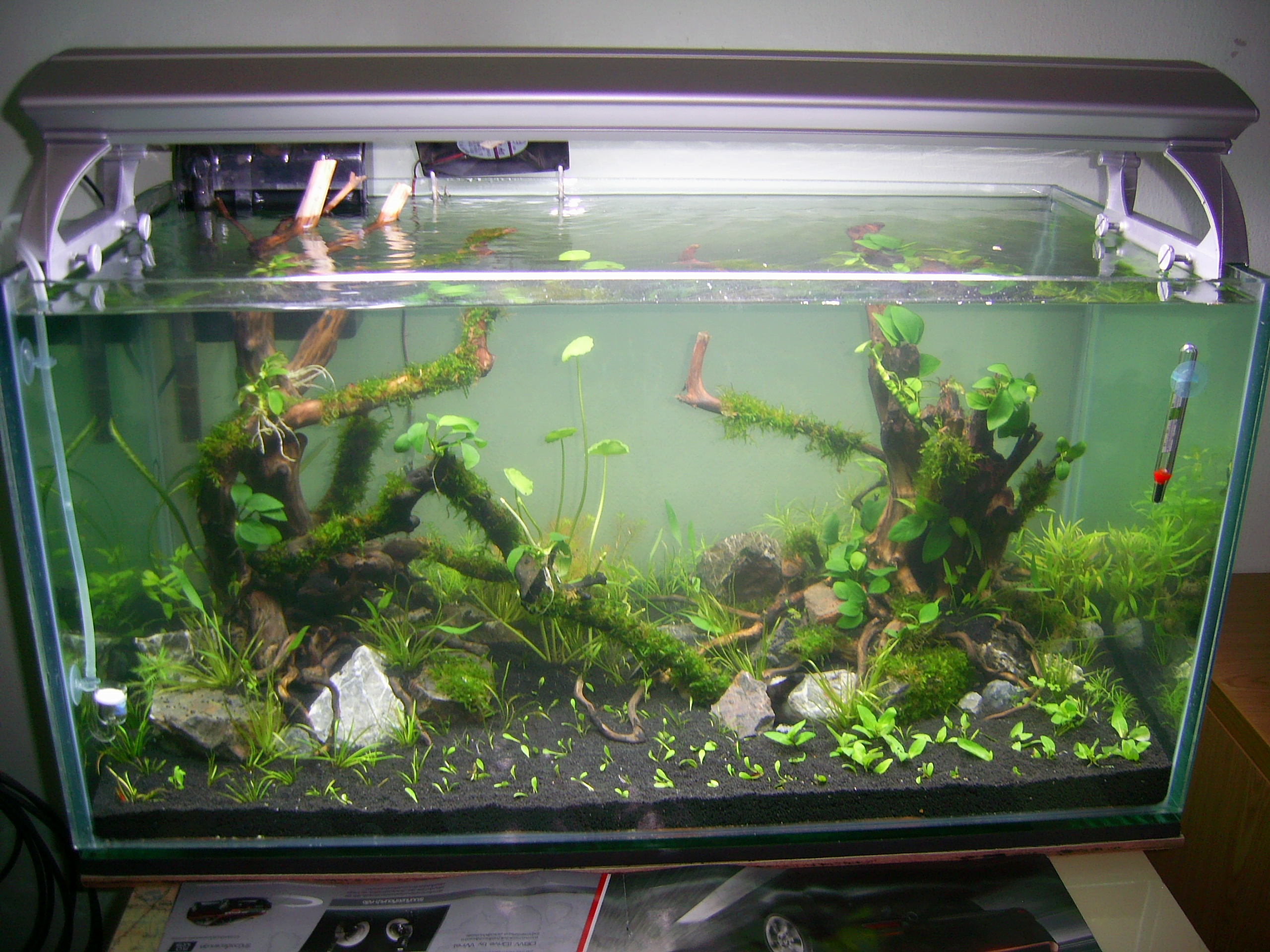 เริ่มได้สวยครับ ได้อามรมณ์แบบป่าอเมซอนดีครับ ความคิดเห็นส่วนตัวนะครับ ลองย้ายต้นสูงๆก้านยาวๆตรงกลางตู้ไปไว้มุมใดมุมหนึ่งน่าจะดูดีกว่า หาพวกคลิปมาใส่บริเวณขอนเพิ่มอีกนิด