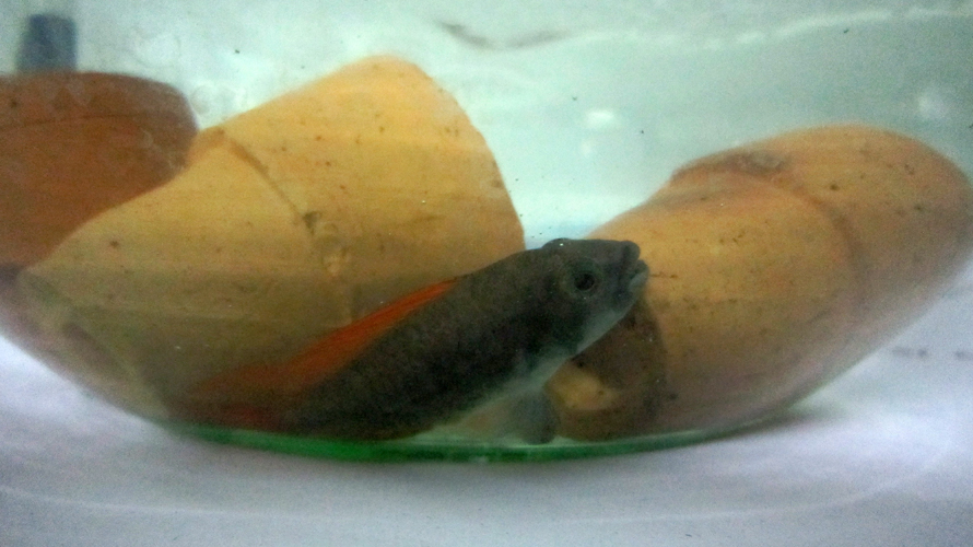เลยลองแหย่ดู ปรากฏว่า ว่ายไม่ไหว สีตัวก็ดูดำๆ และตามีฝ้าๆด้วย เลยแยกมาไว้ที่โหลค่ะ ให้อ๊อก