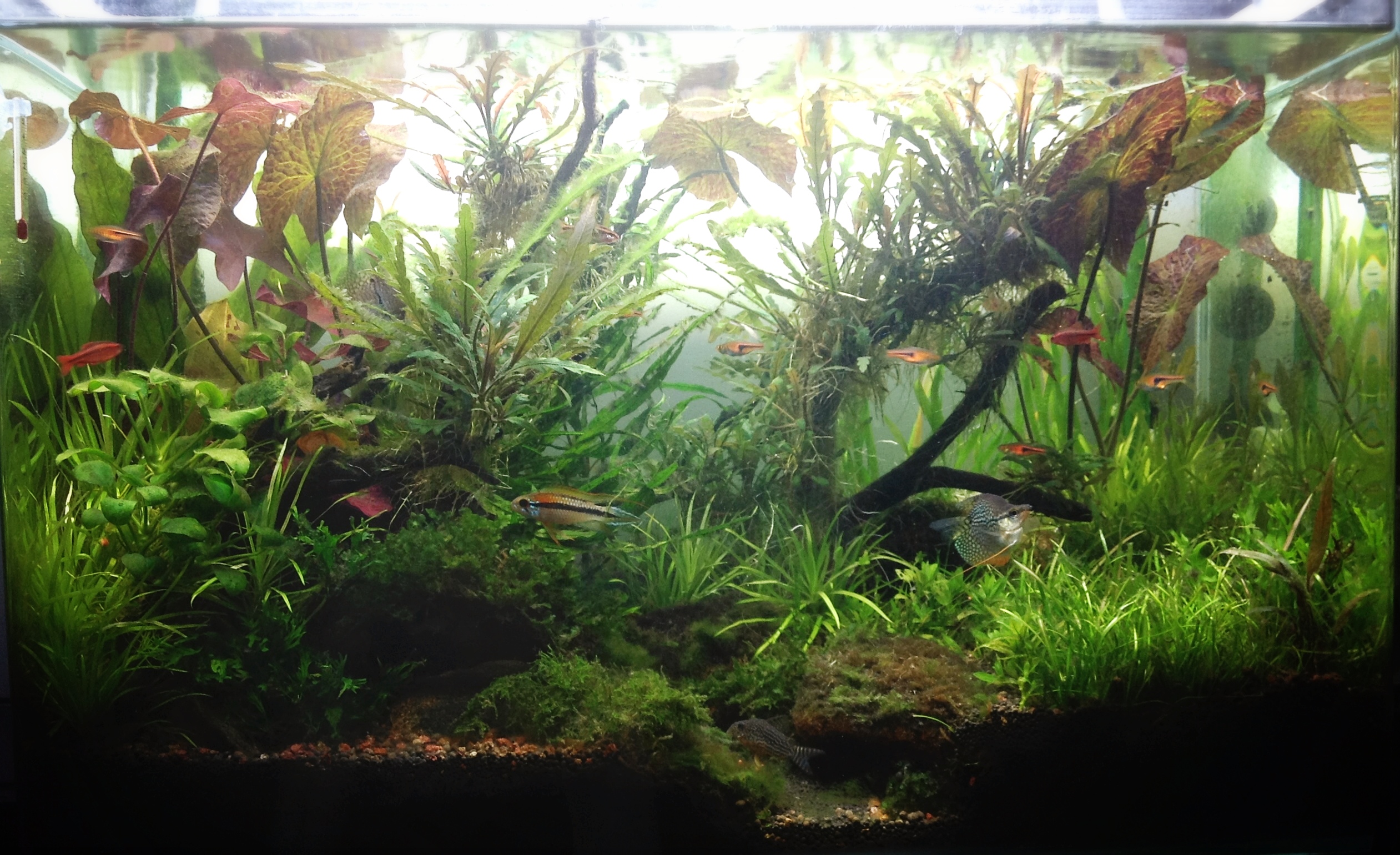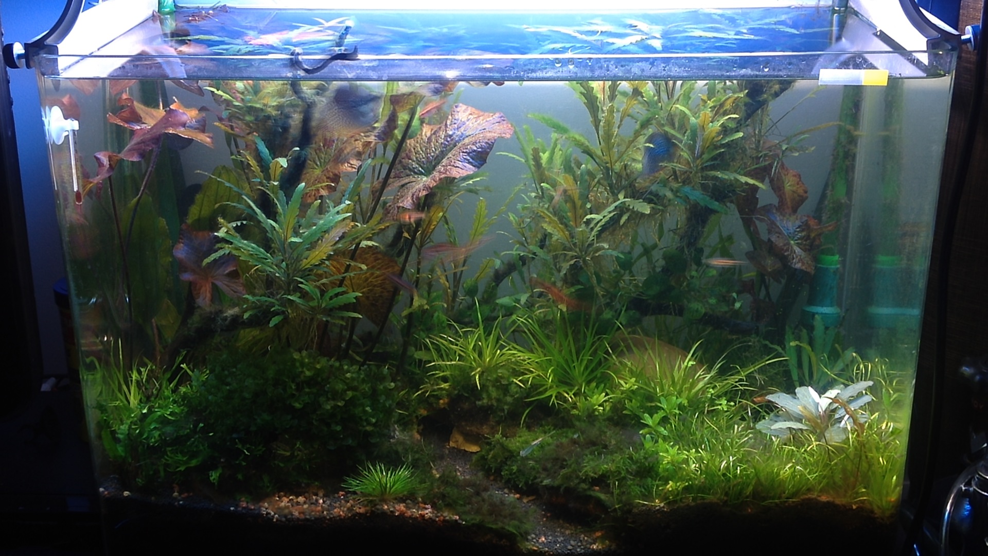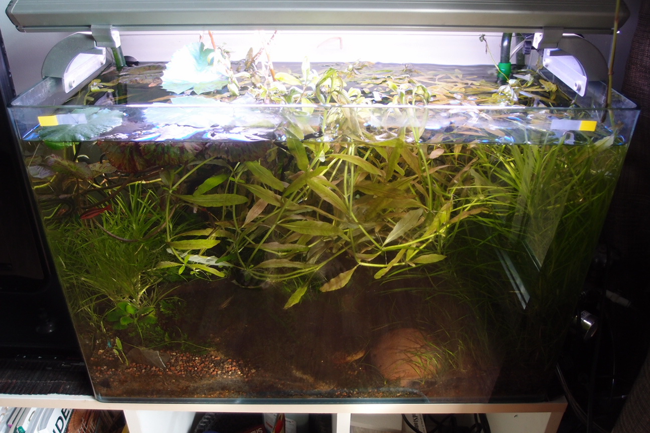 ฺBucep น้อยๆสองต้น Silver Grey ออกดอกต้นนึง และ Sankadou เป็นฉากหลัง บัวไต้หวันและบัวไทเกอร์แตกหน่อชูยอดเพิ่มอีกสองต้น แซมหน้าตู้ด้วยกระดุมน้อย