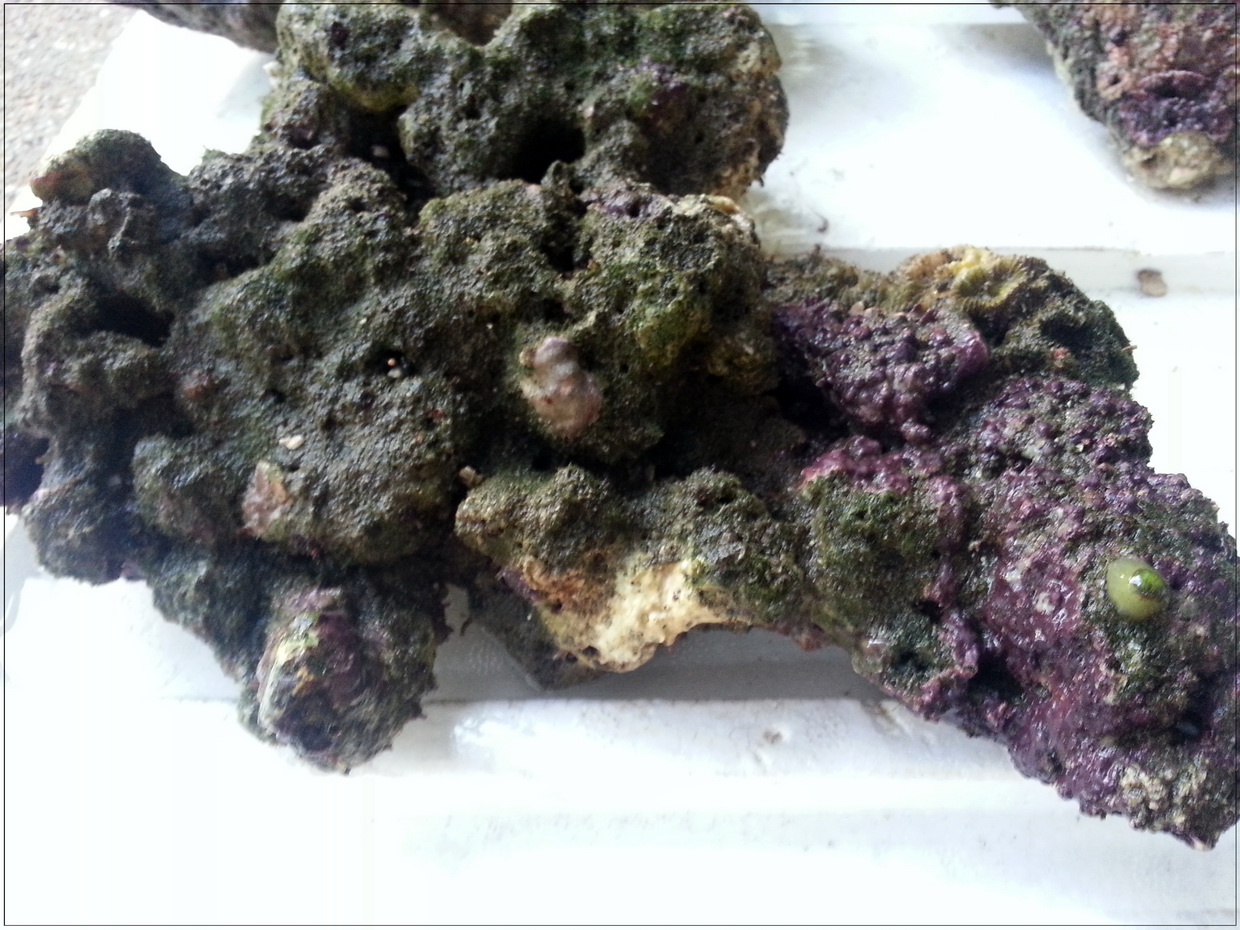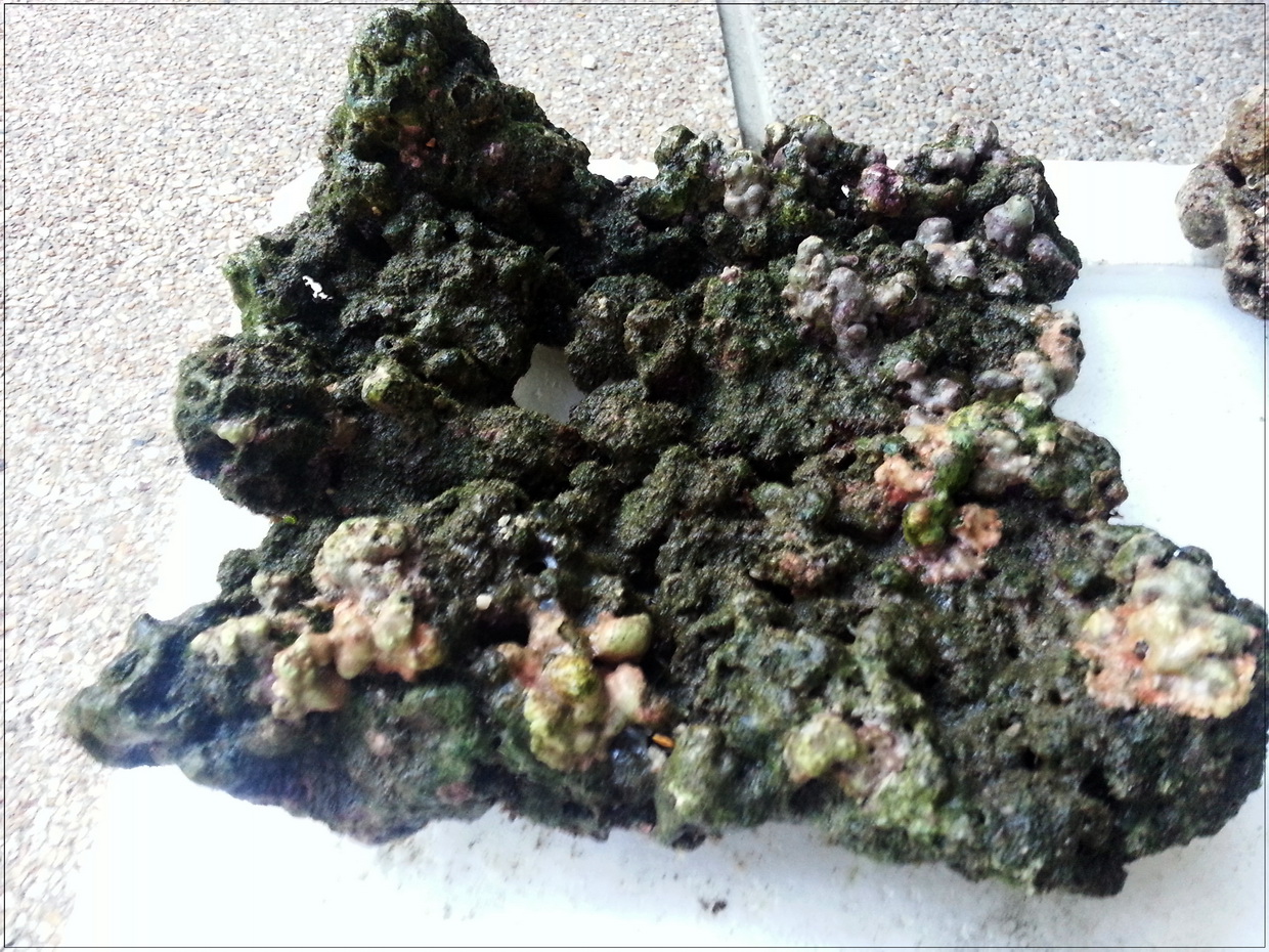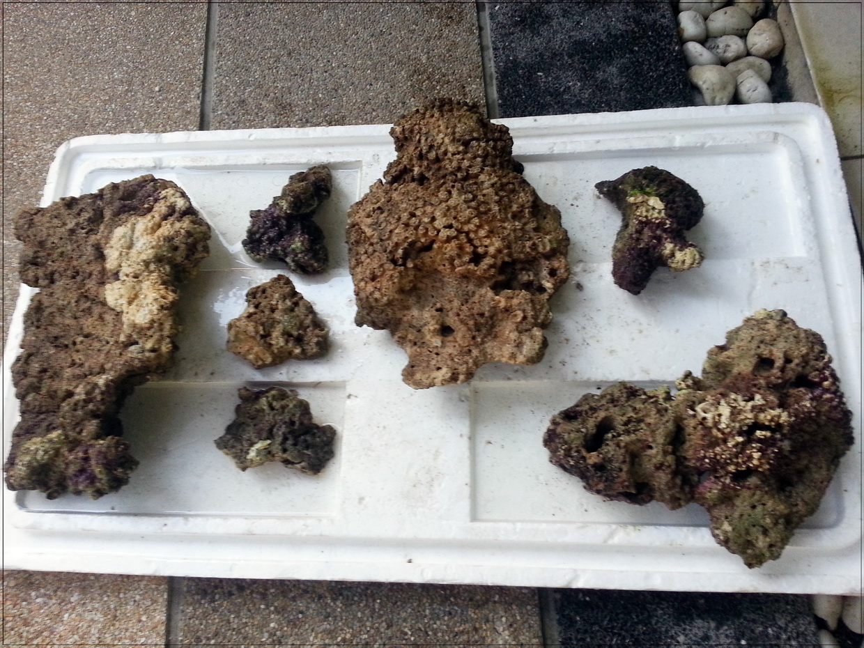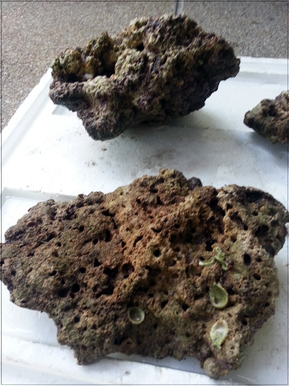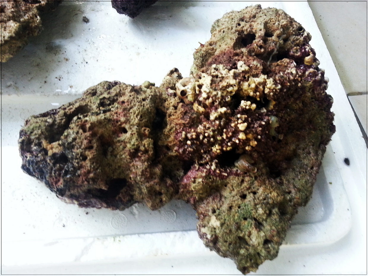 3. หินบางก้อนมีตะไคร่เขียวขึ้นคลุม ตอนรื้ออกได้เอาแปรงขัดออกไปบางก้อน แต่บางก้อนไม่ได้ขัด เพราะมือแหก หินบาด (ขัดในน้ำเค็มจากตู้ ไม่ใช่น้ำประปา) ตอนนี้เลยกำลังบำบัดโดยอัดแบคทีเรีย ไปเรื่อย ๆ