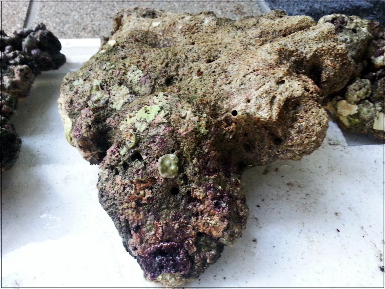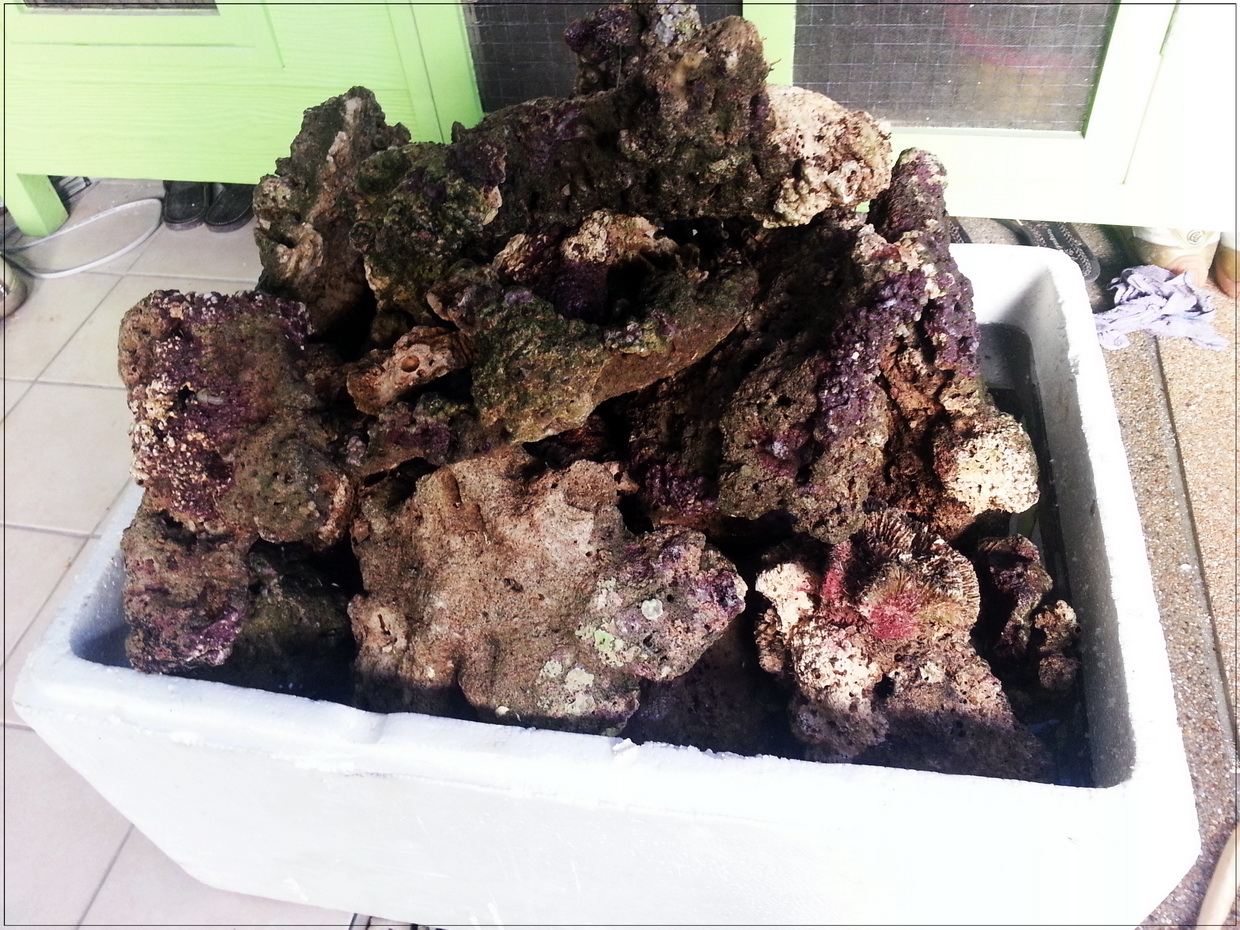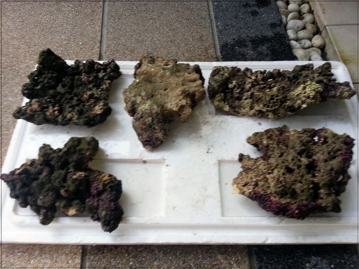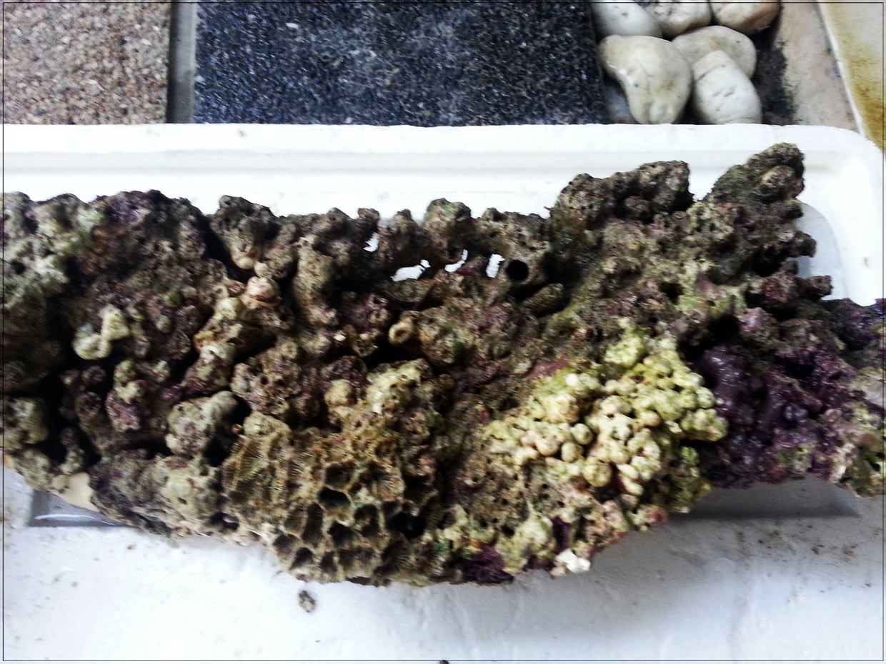 3. หินบางก้อนมีตะไคร่เขียวขึ้นคลุม ตอนรื้ออกได้เอาแปรงขัดออกไปบางก้อน แต่บางก้อนไม่ได้ขัด เพราะมือแหก หินบาด (ขัดในน้ำเค็มจากตู้ ไม่ใช่น้ำประปา) ตอนนี้เลยกำลังบำบัดโดยอัดแบคทีเรีย ไปเรื่อย ๆ