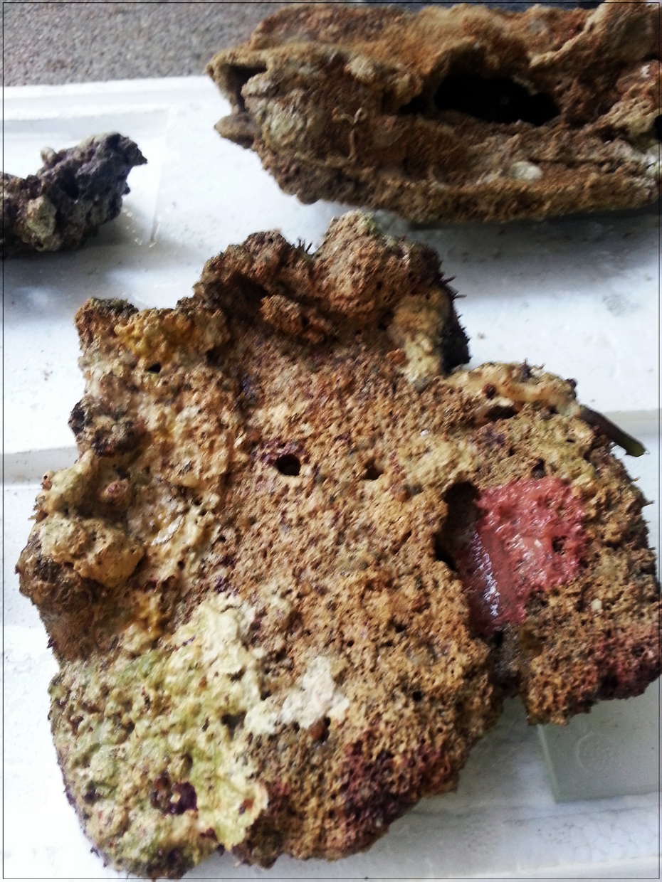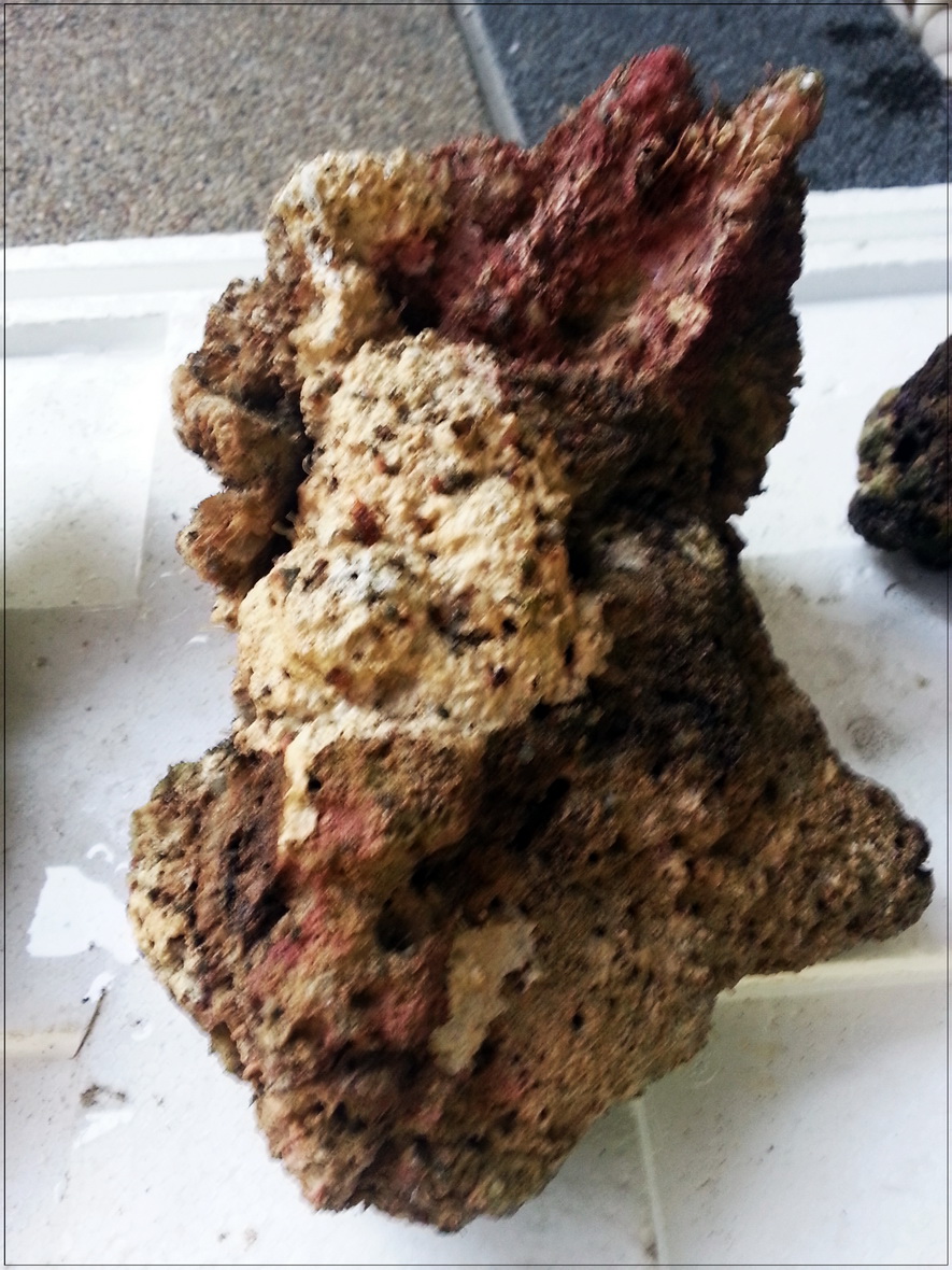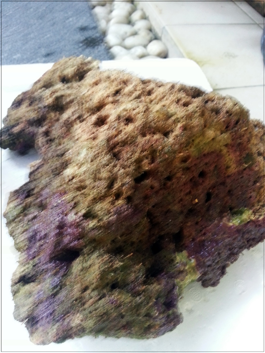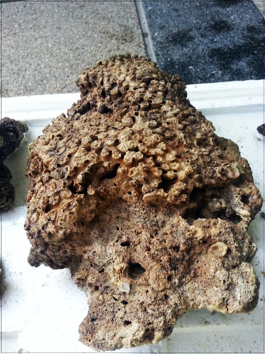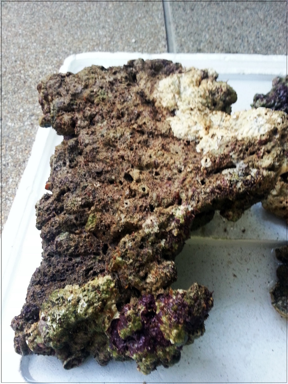 3. หินบางก้อนมีตะไคร่เขียวขึ้นคลุม ตอนรื้ออกได้เอาแปรงขัดออกไปบางก้อน แต่บางก้อนไม่ได้ขัด เพราะมือแหก หินบาด (ขัดในน้ำเค็มจากตู้ ไม่ใช่น้ำประปา) ตอนนี้เลยกำลังบำบัดโดยอัดแบคทีเรีย ไปเรื่อย ๆ