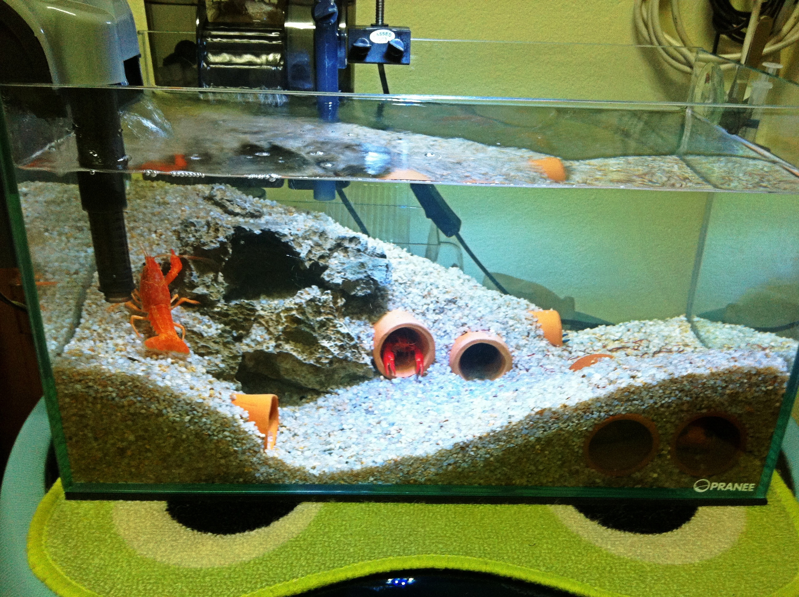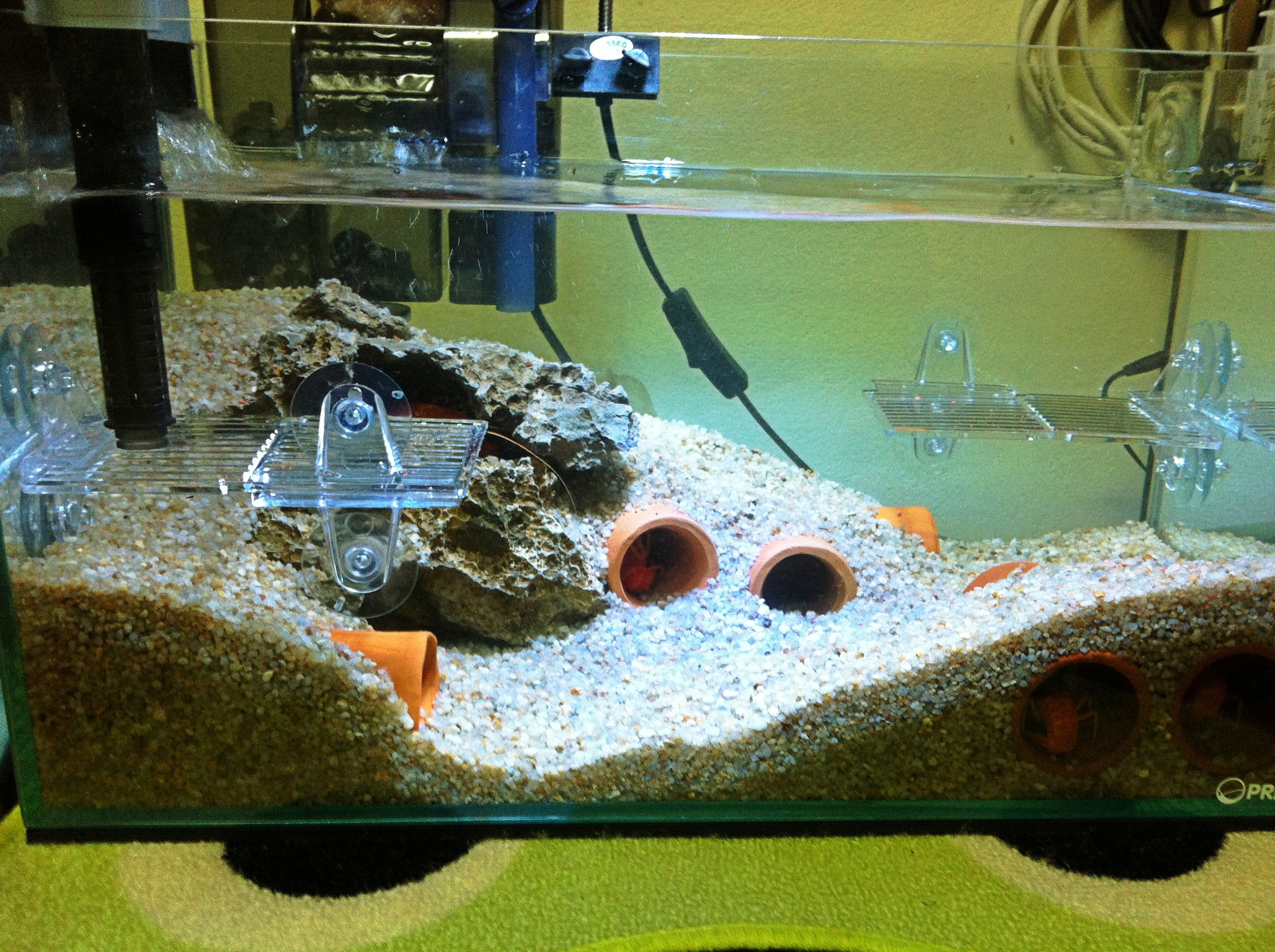 เอาหินจัดซ้อนกันทำเป็นภูเขาเเละมีถํ้าสองชั้นครับ ส่วนท่อดินเผาเอามาฝังใต้ทรายไว้ด้านหลังตู้2ท่อ หน้าตู้ด้านขวา2ท่อวางติดกระจกเพื่อให้เราดูกุ้งง่ายๆครับ เวลากุ้งอยู่ในท่อ ผมชอบนะ 555 เเละอีกท่อวางไว้หน้าซ้ายครับ ใช้กรองนอก1(ในภาพยังไม่ได้เอามาติดครับ พอดีเอาไปล้างอยู่ครับ) กรองเเขวน2ตัว ติชมได้นะครับ  ้hahaha ตอนเเรกจะทำตู้ซ้อนตู้ เเต่มันดูรกๆเลยทำเเบบนี้ดีกว่าครับ