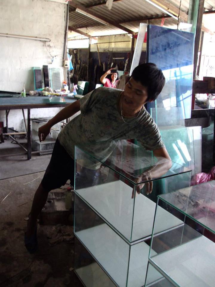 ตู้ aa เจียรมือ และ aaa เจียรคอมพ์ ตู้ไร้ขอบไร้คานสวยๆ ที่พวกเราชาวไม้น้ำได้ซื้อหาไปจัดตู้ กันนั้น ต้องผ่านมือช่างตัดกระจกประกอบตู้ปลาท่านนี้ครับ ช่างกร ( เงินเดือนหลายหมื่นเลยครับ+ เปอร์เซ็นต์ยอดขายตู้ด้วยนะ ) เป็นลูกน้องคู่บุญของพี่หมี ซึ่งเป็นเจ้าของโรงงานตั้งอยู่ไม่ไกลจาก กทม.