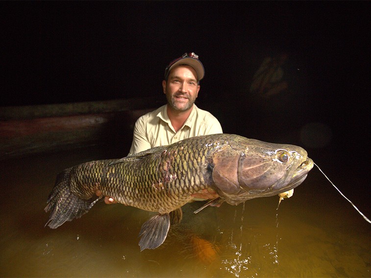 Zeb Hogan holding a 4 foot long Wolf Fish, caught on a night