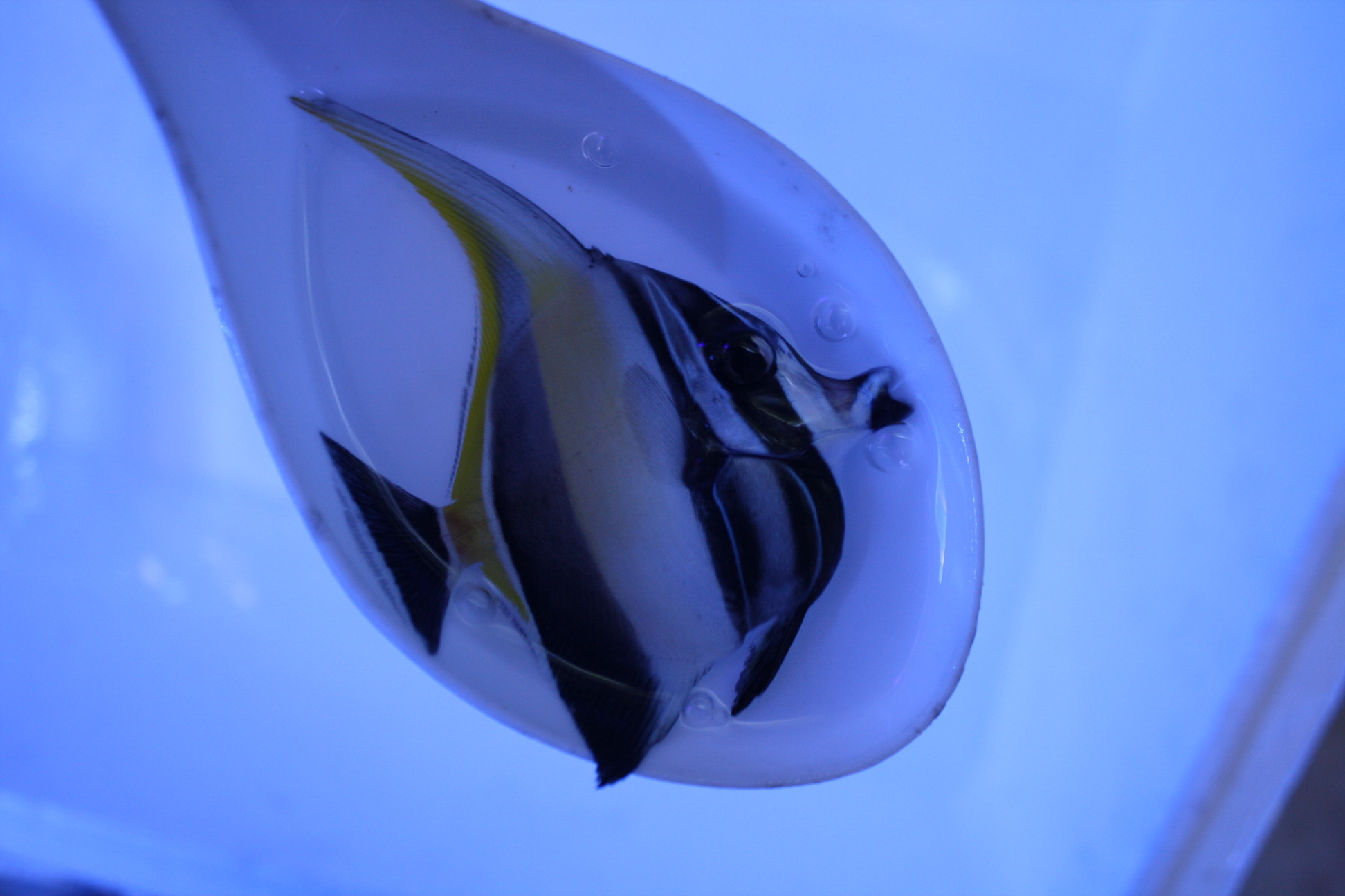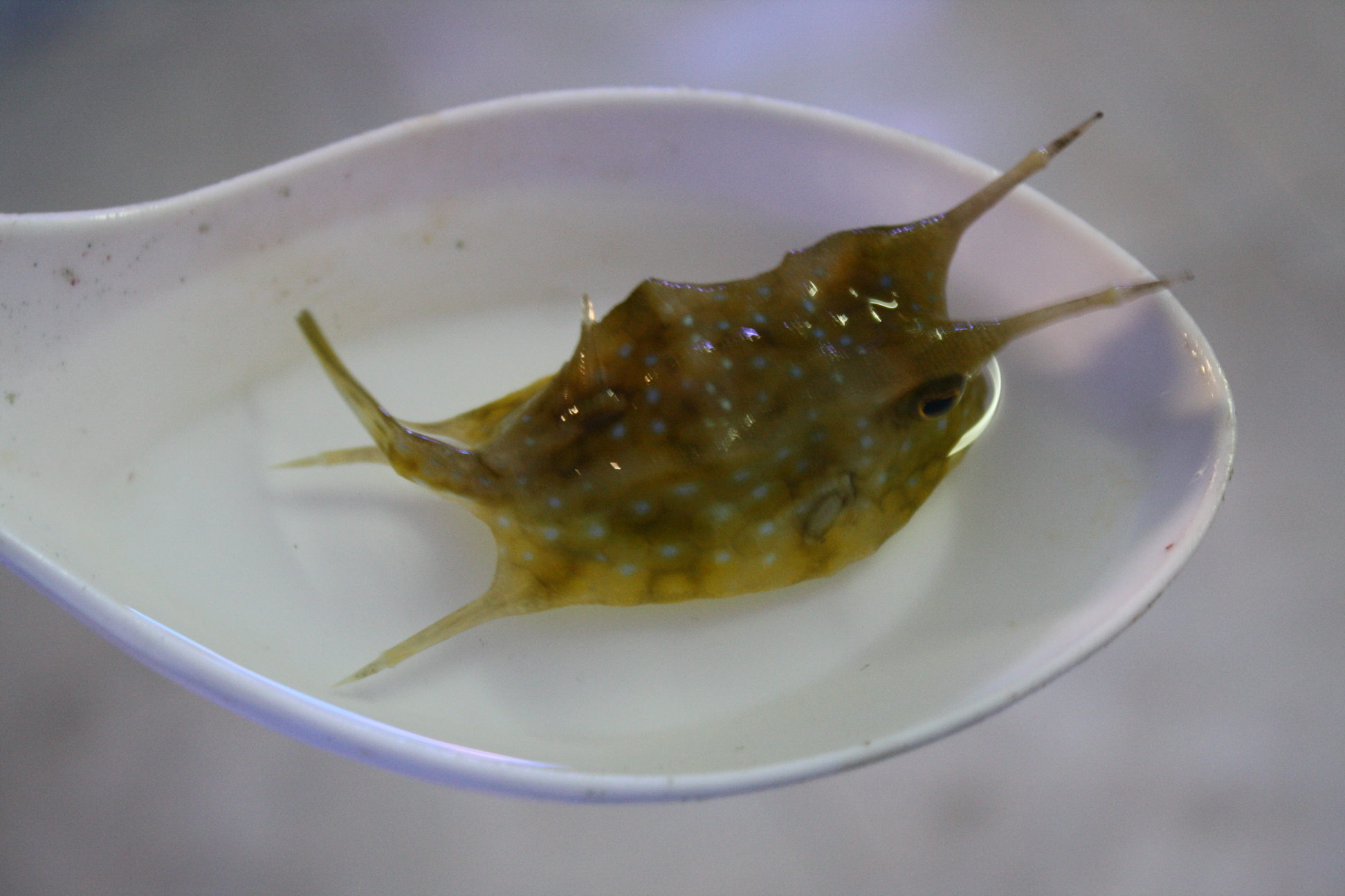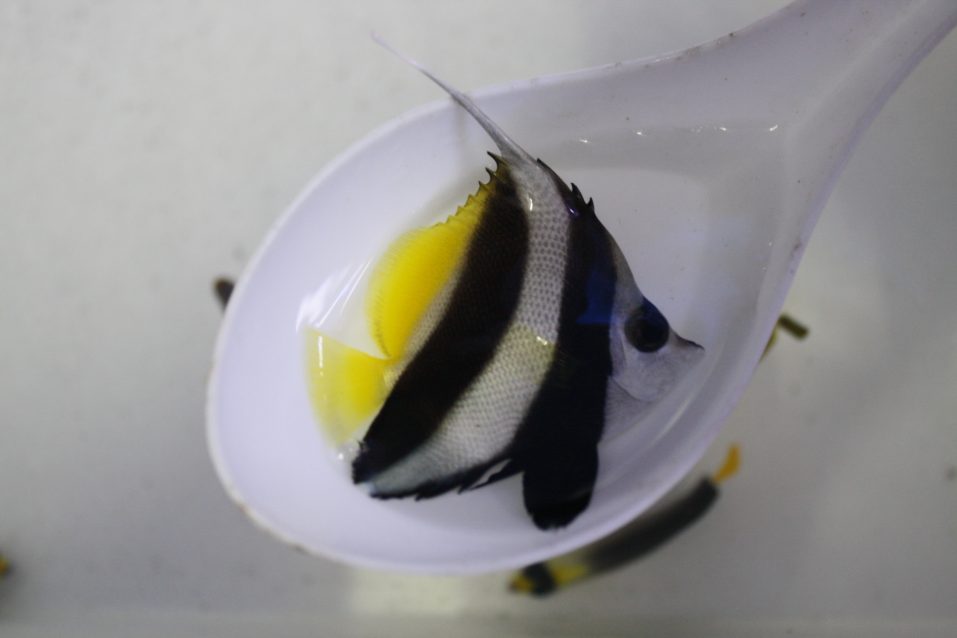 ปักเป็ากล่องเหลืองจุดดำ 2.5 นิ้ว 450 ไม่กินเม็ด กินอาหารแผ่น