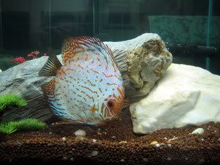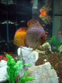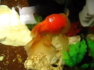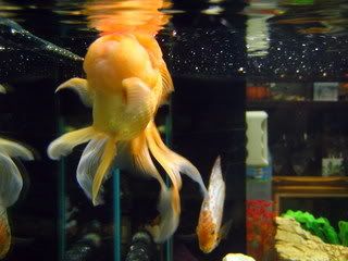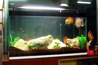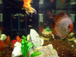 ในตู้มีปลาปอมปาดัวร์ 2 ตัว ปลาตัวเล็กๆ อีก 10 ตัว กุ้งฝอย 4 ตัว ปลาหมูอินโด และปลาทองหัววุ้นอีก 1 ตัว