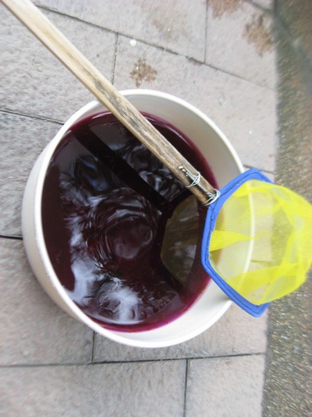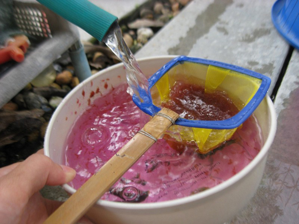5. เทไรทะเลใส่กระชอนใหม่ แล้วเอาขันใส่น้ำ + ด่างทับทิม แช่ทึ้งไว้