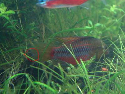 ลักษณะของหาง ที่เหมือนจะโดนกัด มีลักษณะ ดำๆ ครีบหาง ตรงที่เเหวงเริ่มมีสีดำๆๆ