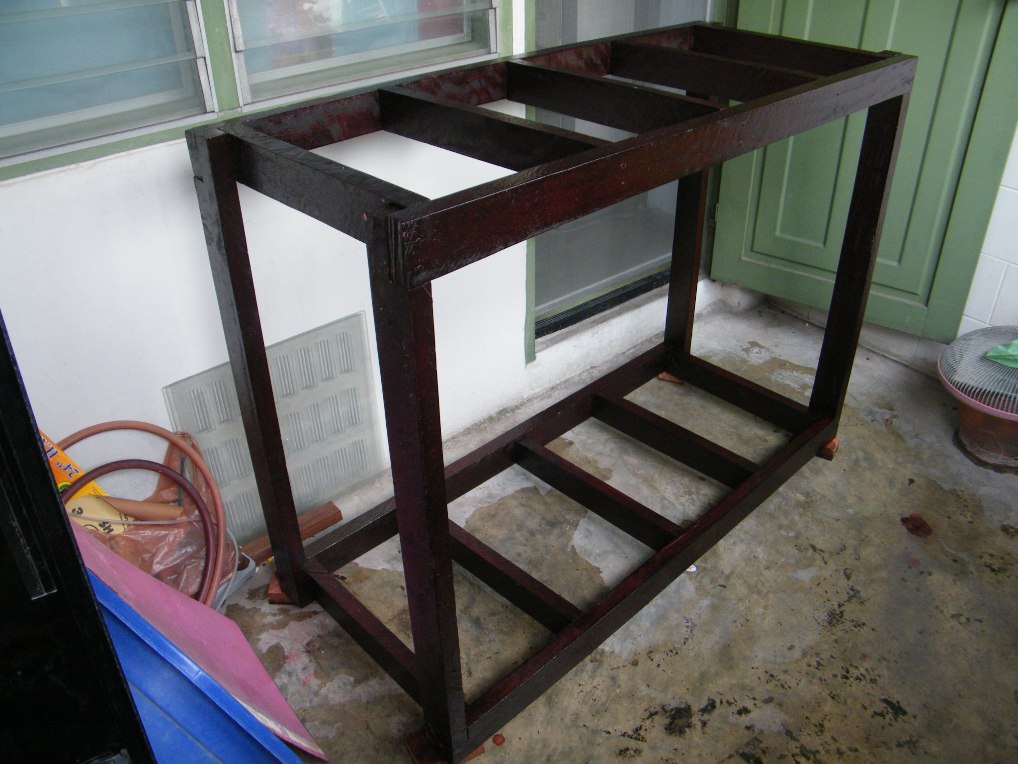 ขาตั้ง เป็นขาไม้ทำเอง ทาสีแดงประดู่เคลือบเงา ไม่ค่อยสวยแต่แข็งแรง (เฉพาะไม้กับสีเกือบพันแล้วครับ)