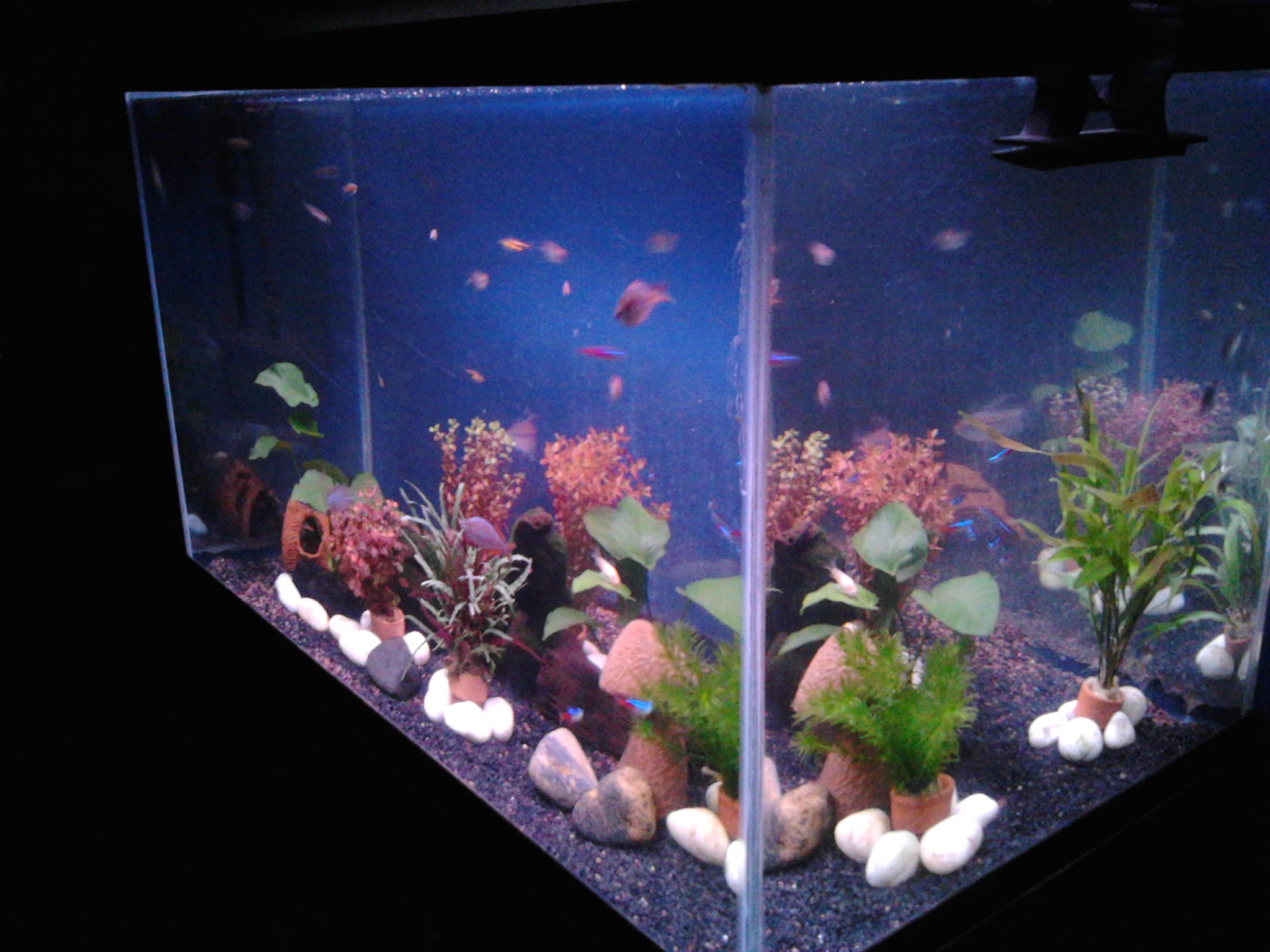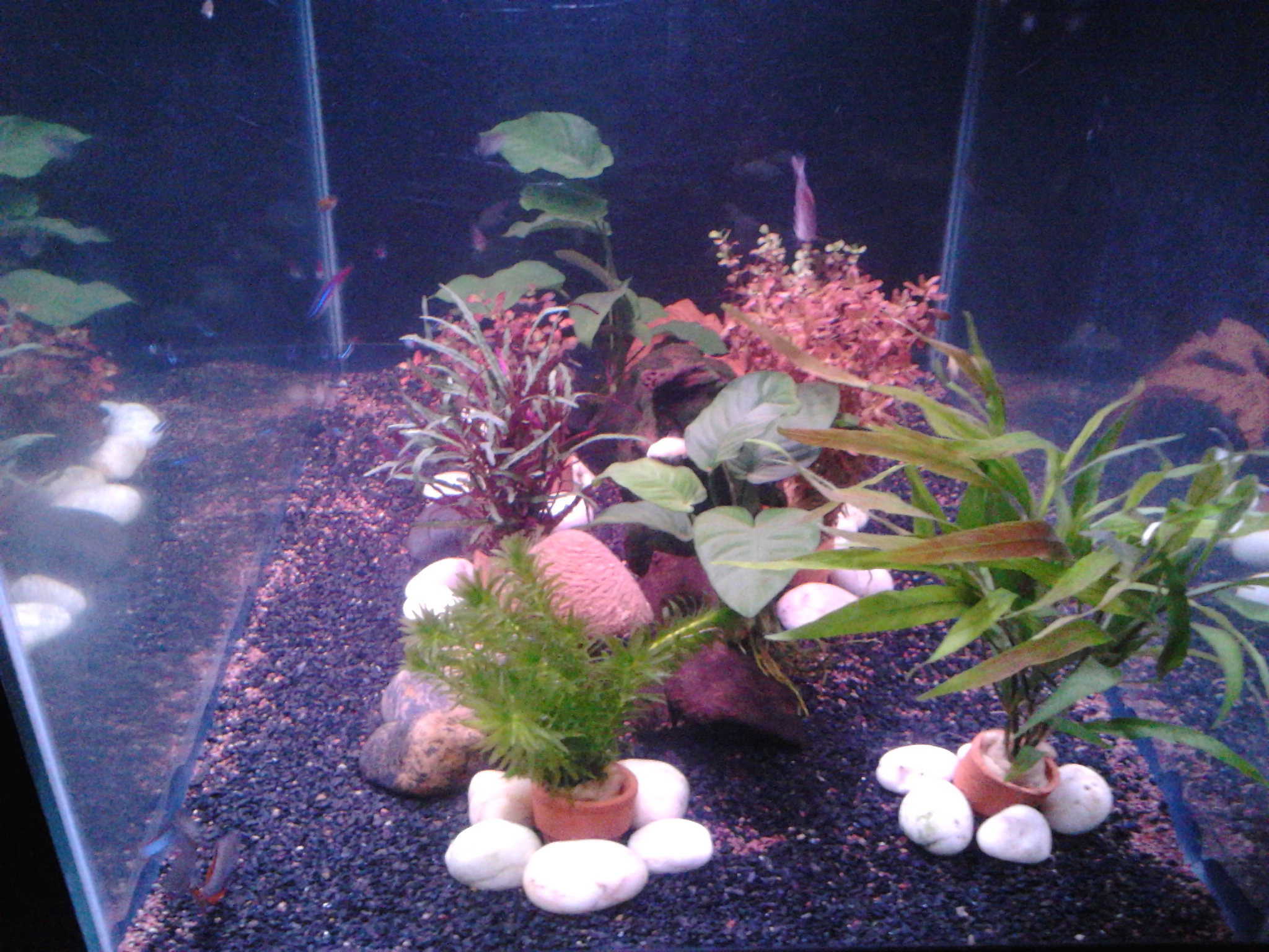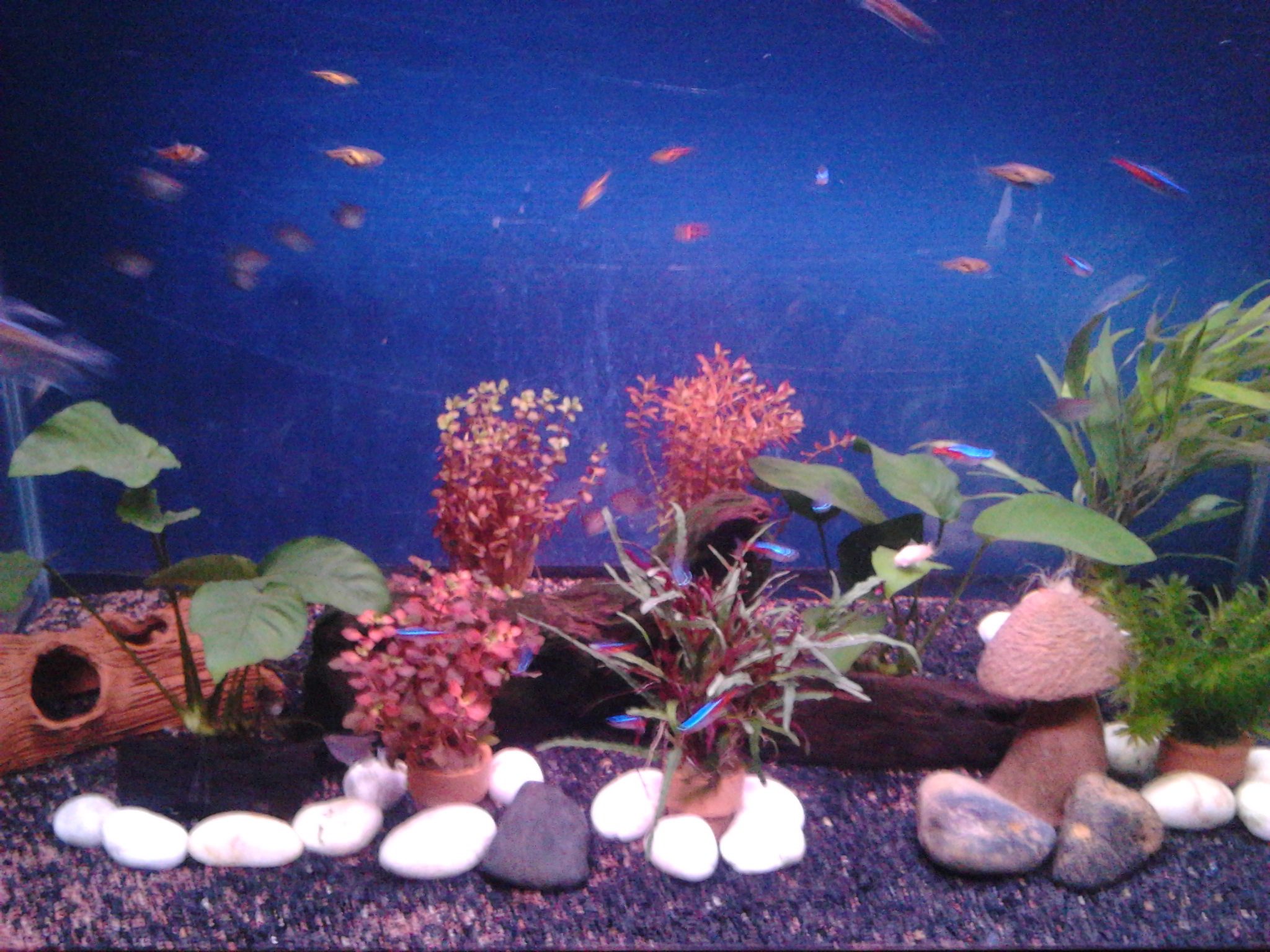 พอดีมีตู้ปลาทอง 30 นิ้วเก่า ๆ อยู่ว่าง ๆ ก้อเลยลองตั้งตู้ไม้นำต้อนรับน้ำท่วม อุปกรณ์ไม่อะไรเลยมีแต่กรองแขวน dolphin 500 litre/hour กรวดทรายบาง ๆ ต้นไม้ 6 กระถาง 50 บาท ปลาพื้น ๆ ไฟรางทอปสีชมพู ไม่รู้ว่าจะรอดหรือเปล่า กระจกรอยขีดข่วนมันเยอะมากเลย อยากจะเปลี่ยนตู้แระ