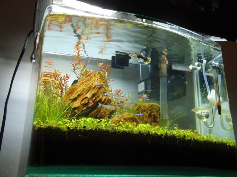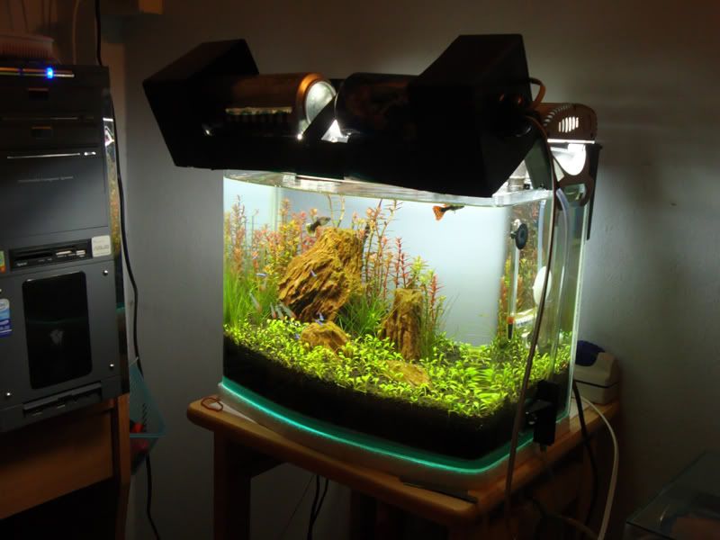 คือตู้นี้พอดีเป็นตู้แรกอ่าครับ เท่าที่ศึกษาเวปนี้มาประมาณ 1 เดือนกว่าๆ เลยเลือกเอาต้นไม้ที่ต้องใช้ไฟมาก 2 ตัวมาจัด ตู้นี้ตอนตั้ง ลงกรอสโซ่ 2 พอท ครับ (ทิ้งไปก็เยอะ) อัดไฟเต็มที่แล้วก็เลื้อยได้เท่านี้อ่าครับ พอเริ่มเยอะ เอ๊ะ เริ่มมีอาการใบเหลืองให้เห็น   [on_008]