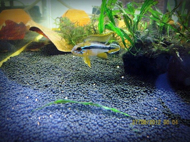 รูปตัวผู้ครับ ที่จริงตอนนั้นในร้านมีตัวผู้ตัวใหญ่อีกตัวอยู่ แต่ผมเลือกตัวผู้ตัวรุ่นๆมาเพื่อฟอร์มเอง ซึ่งก็คือตัวนี้นี่เอง ผมรู้สึกว่าหากเลี้ยงปลาให้โตขึ้นมาในตู้ของเราเอง ปลามันน่าจะปรับตัวกับตู้ของเราได้ และที่สำคัญคือผลิตลูกหลานให้เราเชยชม (ความเชื่อส่วนตัวนะครับ)