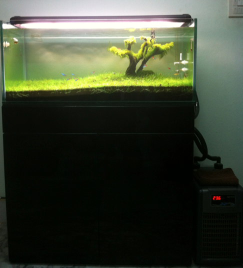 1 เดือนผ่านไปตัดสินใจซื้อ Chiller แต่หวีดจิ๋วยังเลือยช้า กระแสน้ำพัดสารอาหารในดินทำให้ตะไคร่เริ่มเยอะ ช่วงนี้ลงกุ้งเชอรี่ กับ ยาโมโตะ เป็นร้อย ตายเกลี้ยง ช่วงหลังเพิ่งมารู้ว่าหวีดจิ๋วมียาฆ่าแมลงอยู่ เลยตัดสินใจเอาออกปลูกใหม่คับ