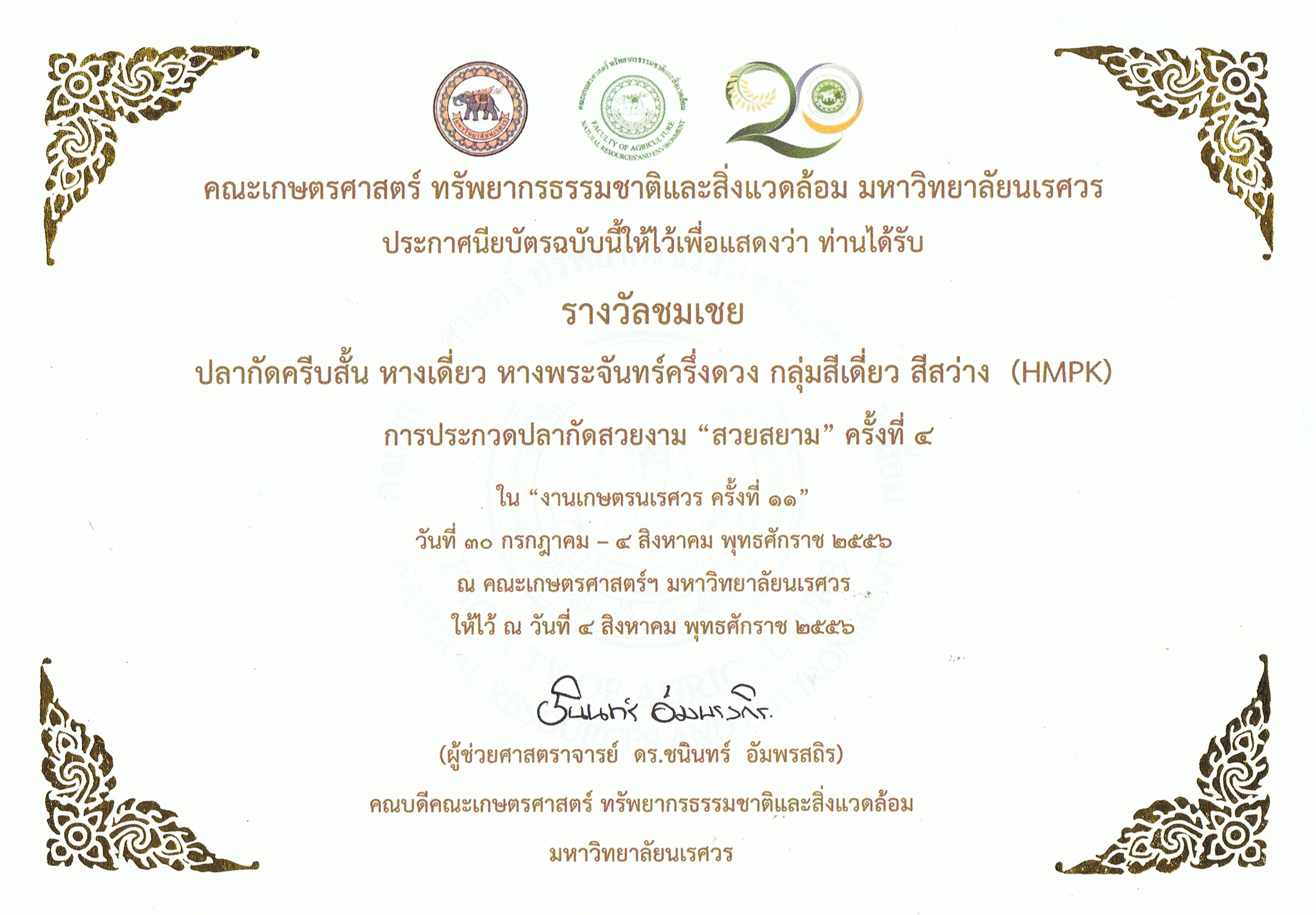 "รางวัลชมเชย" ปลากัดครีบสั้น หางเดี่ยว หางพระจันทร์ครึ่งดวง กลุ่มสีเดียว สีสว่าง (HMPK) ณ การประกวดปลากัดสวยงาม "สวยสยาม" ครั้งที่ 4