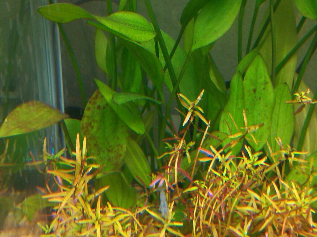 ต้นสีเขียวข้างหลังใช่ไหมครับ น่าจะเป็นอเมซอลนะครับ ผมเคยเห็นมันเป็แบบนี้ในบ่อบัว มีต้นเล็กๆเป็นใบสีแดงเข้มไหม