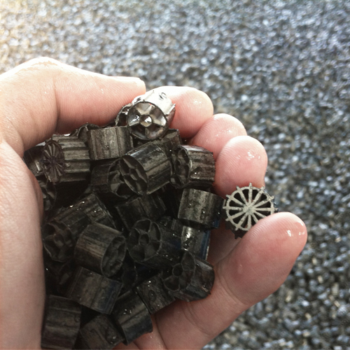 เข้าเรื่องวัสดุกรอง Aquamarine ครับ เป็นวัสดุกรองพลาสติก PE สีดำ แข็งแรงทนทาน และผสมสารต้าน UV มีน้ำหนักเบา แทบจะไม่ต้องล้างตลอดอายุการใช้งาน และไม่ตันเหมือนหินพิมมัส ไม่ก่อให้เกิดค่ากรดด่างเปลี่ยนแปลงเหมือนปะการัง สีดำทำให้พรางตาจากแบคทีเรียที่ดูสกปรก และที่สำคัญมีพื้นที่ในการยึดเกาะมากถึง 954 ตร.ม./ลบ.ม. (โดยปกติ ไบโอบอลที่ใช้กันทั่วไปมีพื้นที่ยึดเกาะเพียง 200-400 ตร.ม./ลบ.ม. ส่วนวัสดุอื่นๆพื้นผิวยึดเกาะน้อยกว่านี้เยอะครับ) บอกได้แน่นอนว่าประสิทธิภาพการกรองของ Aquamarine จะสูงกว่าวัสดุกรองอื่นๆมากกว่า 2-3 เท่าขึ้นไปครับ