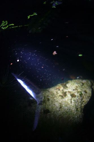 รูปตัวอ่อนกุ้งออกมาว่ายน้ำเล่นแสงไฟ