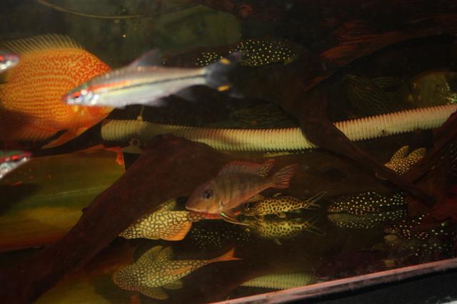 ดูเป็นตู้ที่วุ่นวายใช้ได้นะครับ ทั้งปลา ทั้งขอนไม้ และท่อต่างๆ