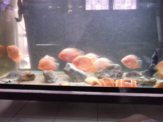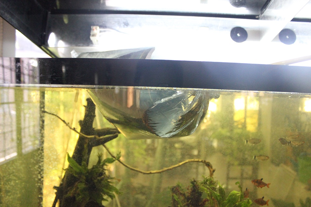 พอครึ่่งชั้วโมงเเล้วก็เเกะถุงเอาน้ำใส่ถุง1ถ้วยกาเเฟให้ปลาปรับน้ำเพราะPHน้ำในตู้เเค่5กว่าๆ เพราะตู้ผมหมักเต็มที่ น้ำเปลี่ยนด้วยน้ำกรองroที่phเเค่6.5เองครับ ได้น้ำดี หมักด้วยใบหูกวาง พีทมอส วัสดุกรองอีก ของหรูด้วยนะ ตั้งห้าใบเทา [on_018]