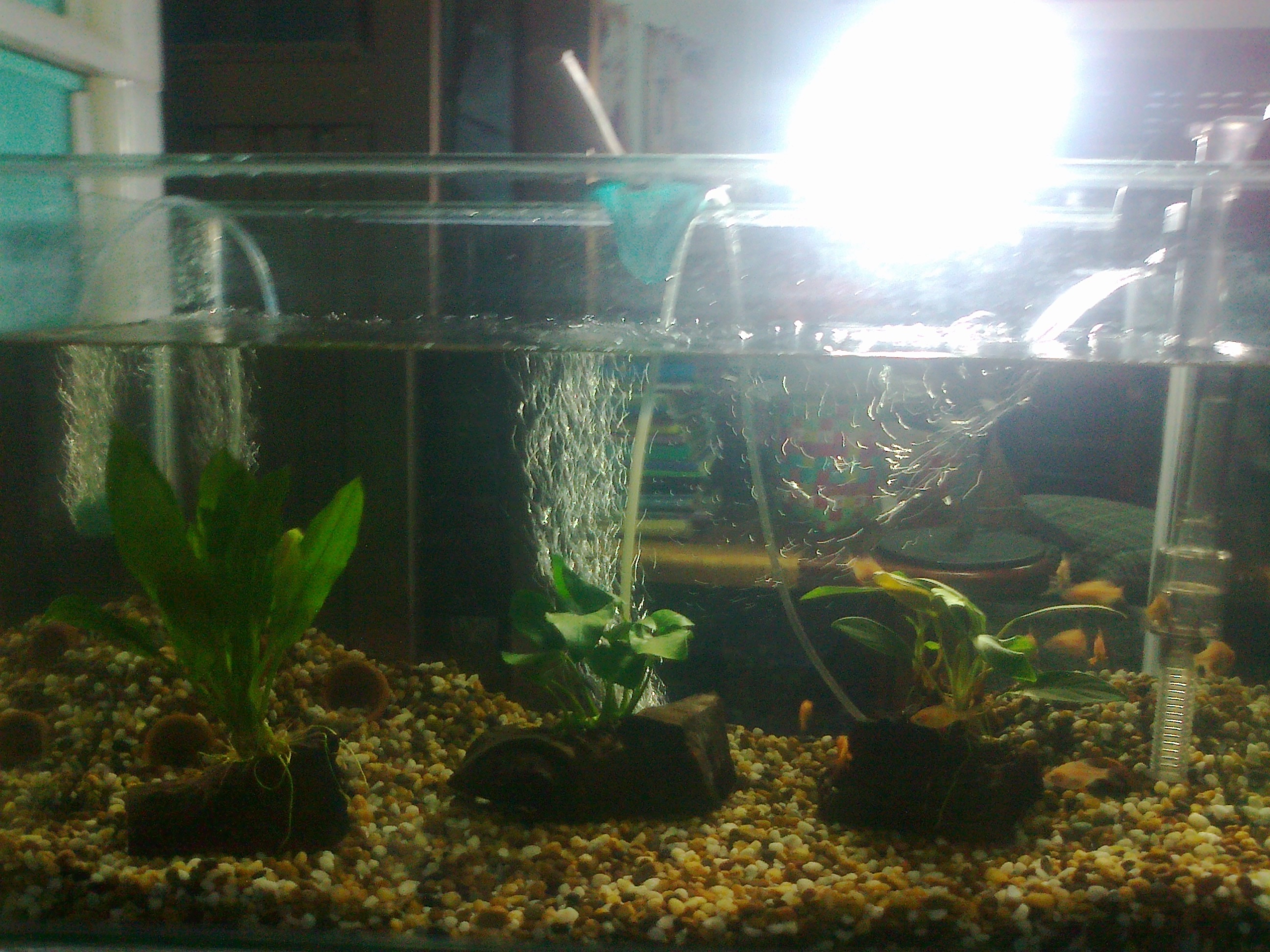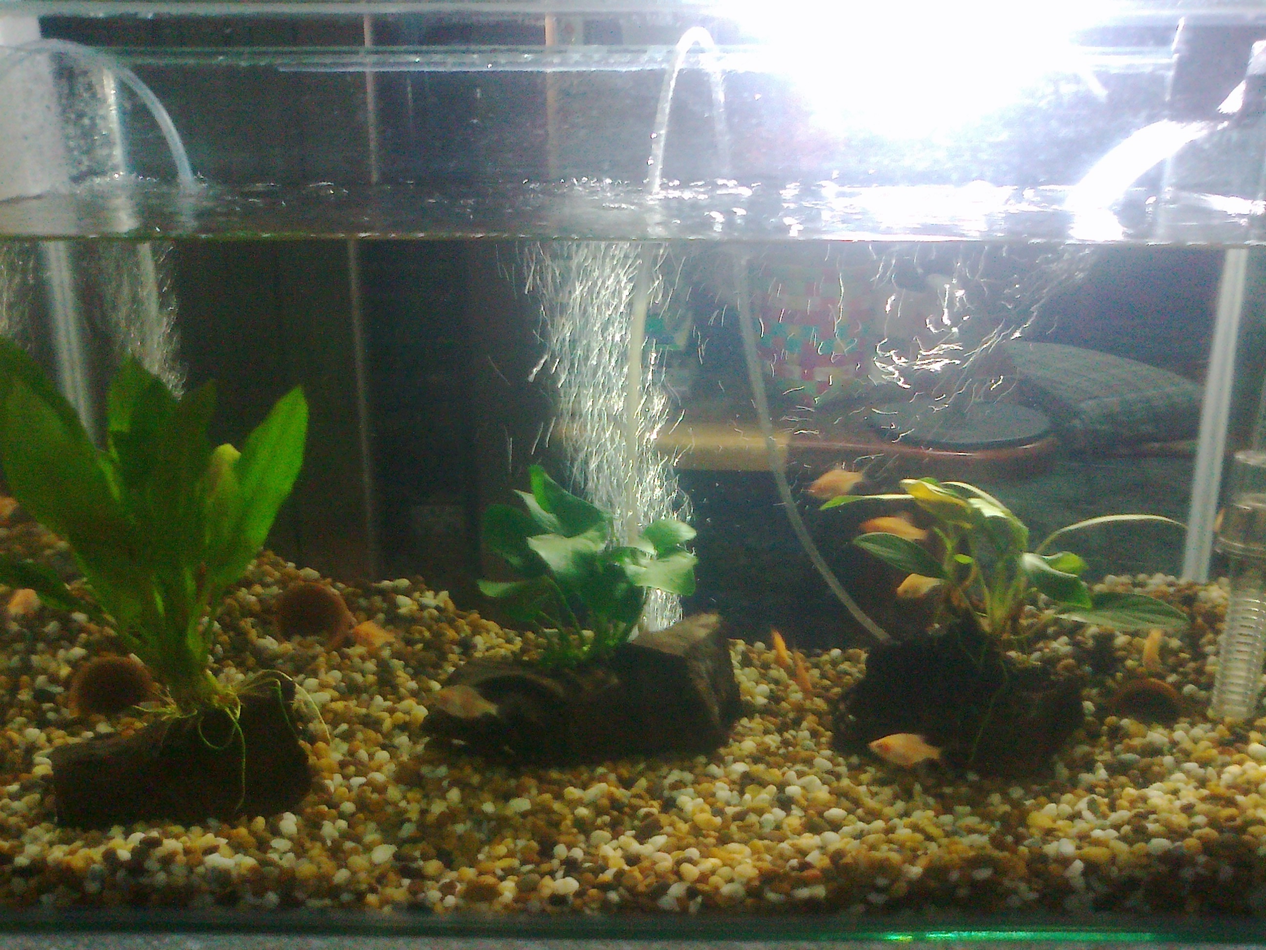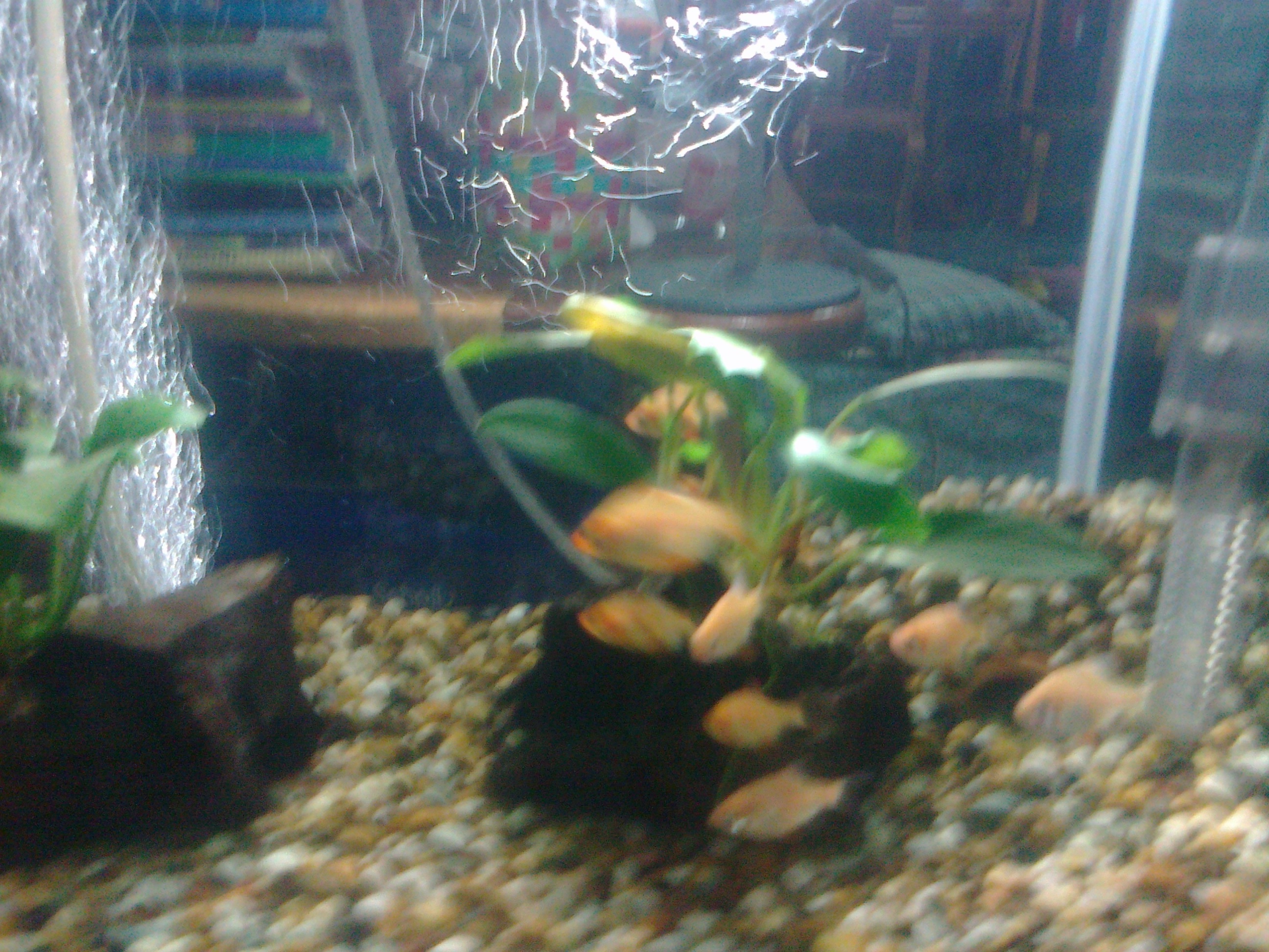 เอากรวดออกให้ กรวดบางลงกว่านี้ กระถางเอาออกปาย ปลามันชอบว่ายน้ำเป็นฝูงๆ ไม่หลบกระถางหรอกครับ