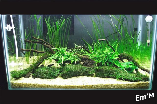 คิดว่าขอนมอสมันอยู่ชิดด้านหน้าตู้มากเกินไปนะครับ กลัวว่าเวลามอสฟู ไอ้พื้่นที่ด้านหน้ามันจะหายไป กลายเป็นมุมอับซะแทน ส่วนอนูเบียส ที่มันไม่เข้าเพราะมันมีอยู่หน่อเดียว ลองหามาเพิ่มพันไล่ตามขอน น่าจะดูดีขึ้นนะ  lau02
