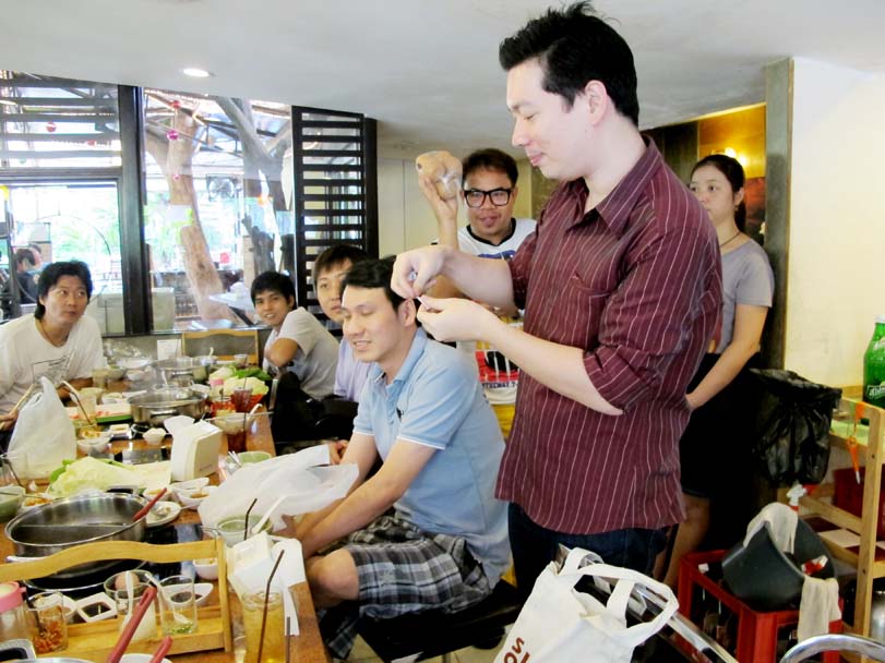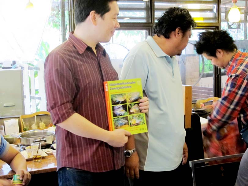 น้องแม็คเสื้อขาวด้านในสุดตรงข้ามพี่เอกก็มาร่วมงานด้วย คุณแชมป์กับพี่อ๊อดกำลังสั่งอาหารอยู่ ส่วนข้างๆพี่อ็อดคือเพื่อนพี่อ็อดชื่อคุณอีฟ(คุณอีฟคอยช่วยงานประกวดปลาหมอแคระคราวที่แล้วจำได้ว่าตอนวันงานวันสุดท้าย)