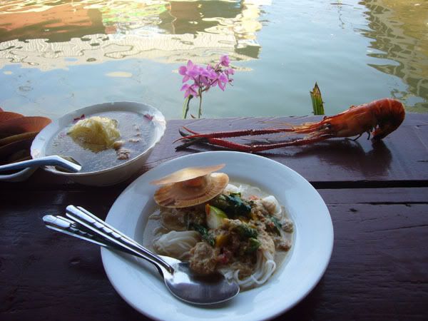 ลือชื่อ ณ ที่แห่งนี้ คือกุ้งแม่น้ำเผาสดๆ ครับ ทานพร้อมกับขนมจีนแกงลูกชิ้นปลากราย กับต้มจืดกระหล่าปลี