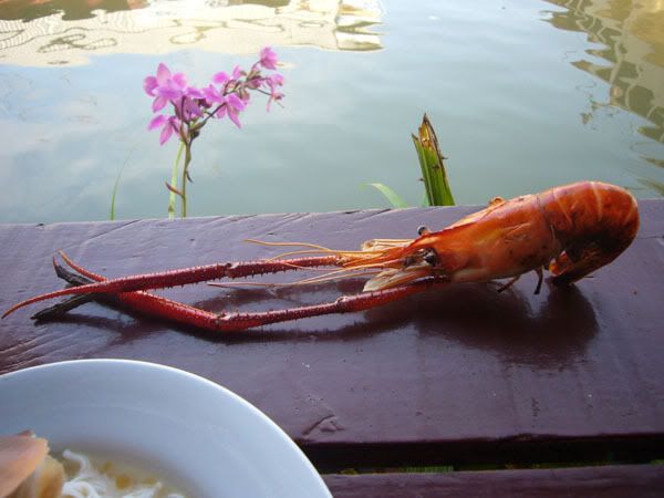 กุ้งแม่น้ำตัวใหญ่เผา สีแดงสด กลิ่นหอม น่ากินมากๆครับ ซื้อกินจากแม่ค้าที่พายเรือมาขายตามลำแม่น้ำครับ
