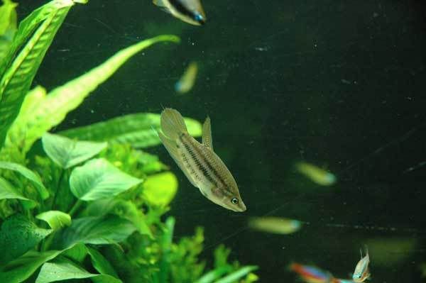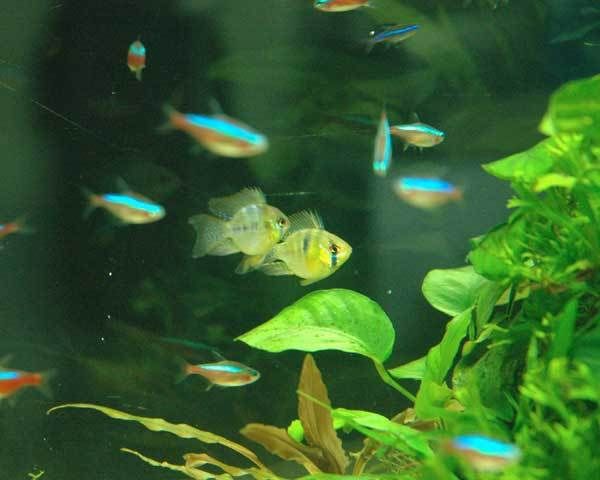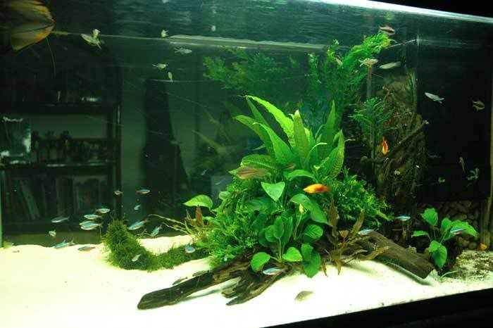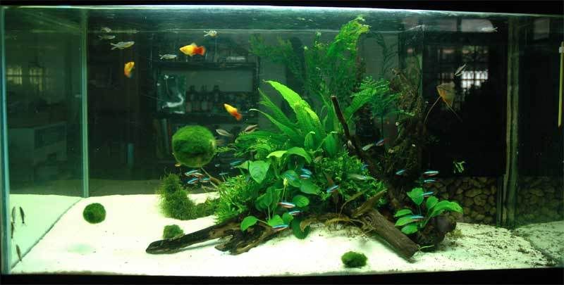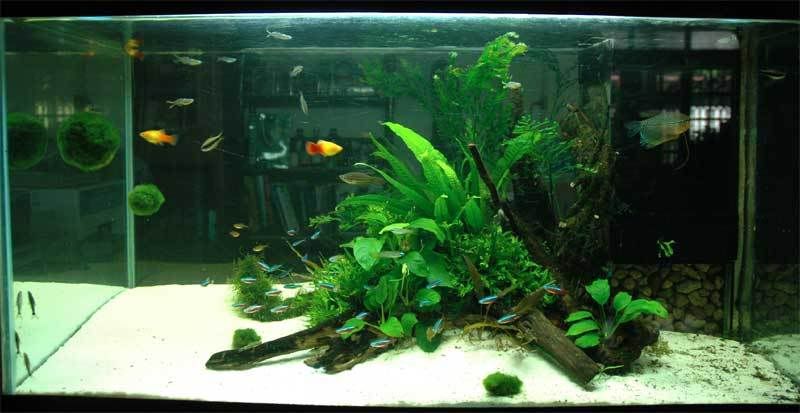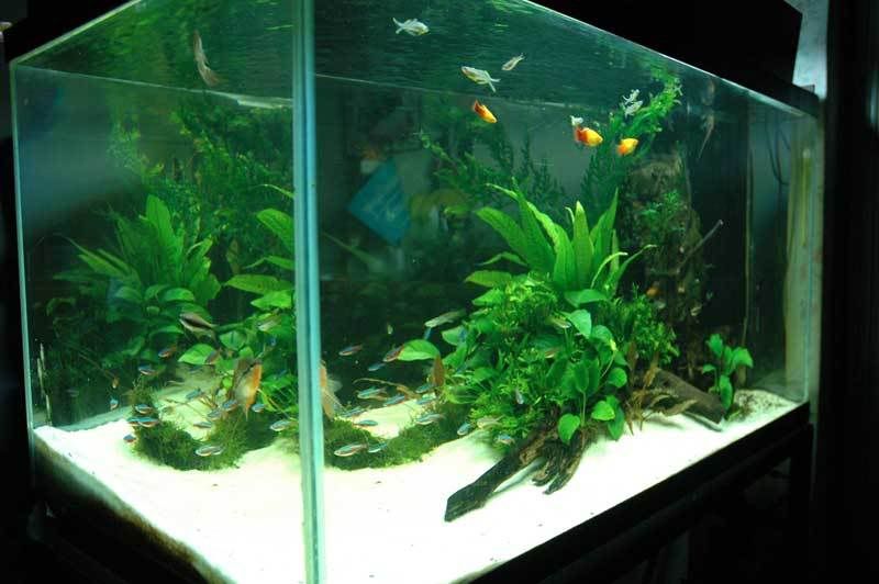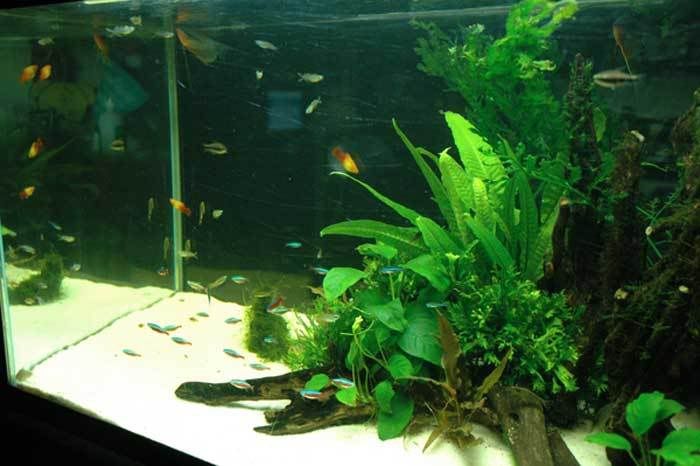 ปลา cardinal ที่ปกติมักจะว่ายกระจัดกระจายไปทั้งตู้ไม้น้ำ จะรวมตัวกันเป็นฝูงอยู่บริเวณรอยต่อระหว่างกอต้นไม้ กับพื้นทราย