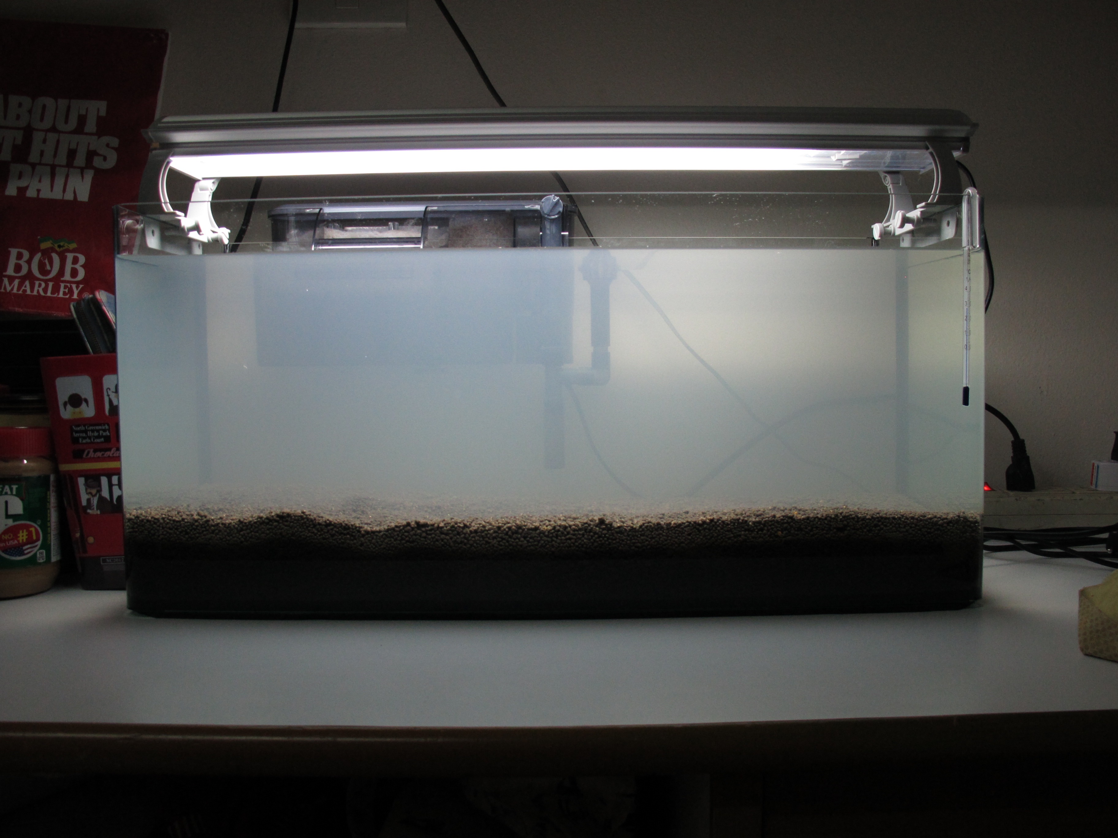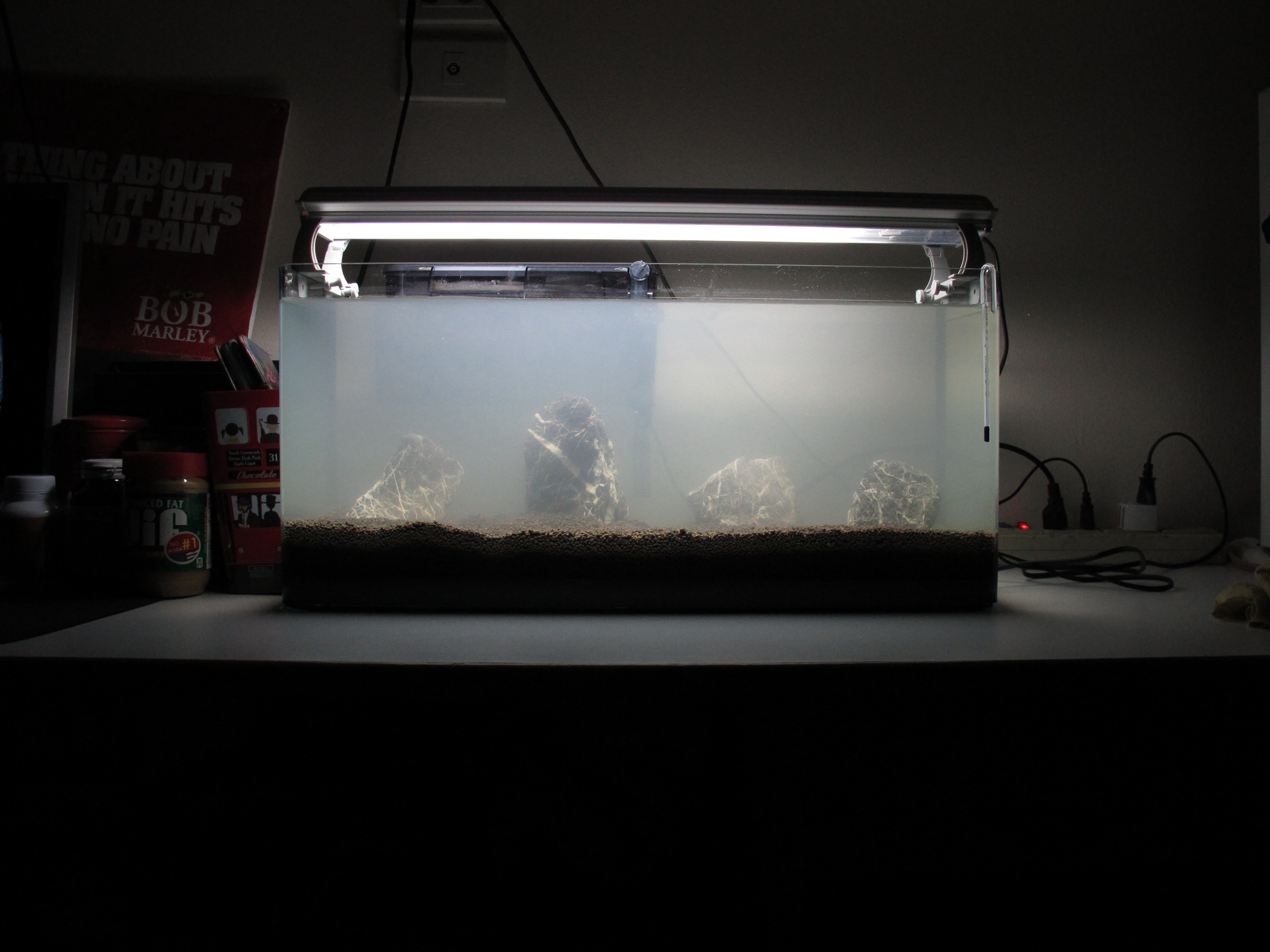 รูปแรก... ตอนแรกใส่น้ำลงไปปกติก็ใสดีครับ หลังจากนั้นรูปที่สอง ผมเปิดกรองไปประมาน 5นาที มันก็เริ่มขุ่นขึ้นครับ รูปที่สาม ก็ใส่หินลงไปในตู้เพราะคิดว่ามันน่าจะ ช่วยลดแรงดันของน้ำ(การไหลเวียนของน้ำในตู้) แต่สรุปแล้วผมคิดว่า ไม่เกี่ยวกับกรองครับ และคงเป็นอย่างที่คอมเม้นของพี่ Nokkaew บอกว่า สาเหตุคงมาจาก แบคทีเรียตายหมดทั้งตู้ เพราะน้ำมันขุ่นๆขาวๆ จริงๆ และนานไปเริ่มสองวันแล้วมันก็เริ่มขุ่นมากกว่าเดิมเป็นสีเดียวกับดิน... คิดว่าไม่นานก็กลายเป็นแบบเก่าครับ... เด่ววันนี้จะเอาดินออกมาตากแดด ครับ!