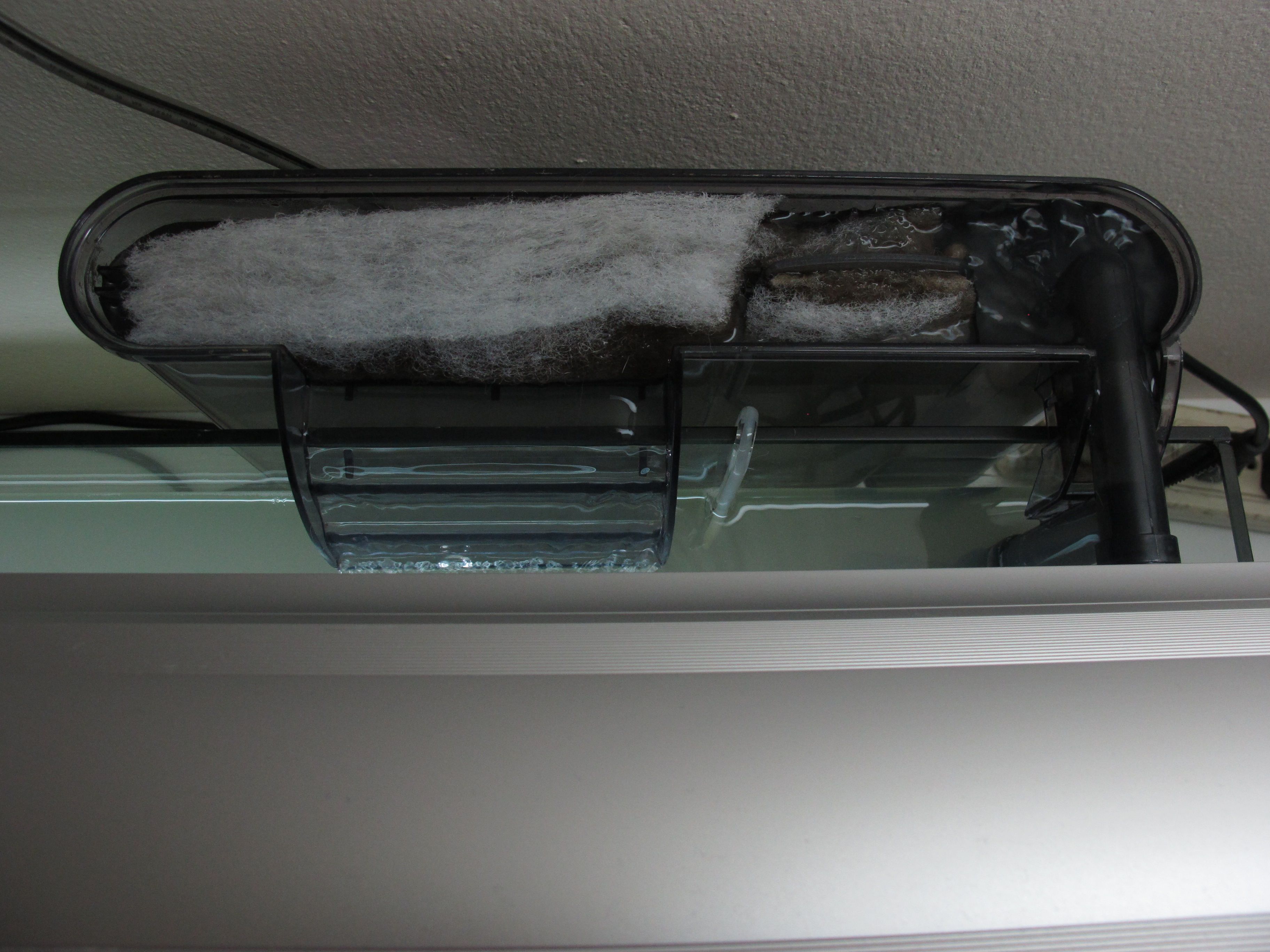 ถ้าครั้งใหม่ แนะนำให้เติมน้ำให้ปิ่มๆ ถึงช่องน้ำออกของกรองแขวนเลยหรือเลยไปหน่อยก็ได้ จะช่วยลดแรงน้ำได้บ้างครับ