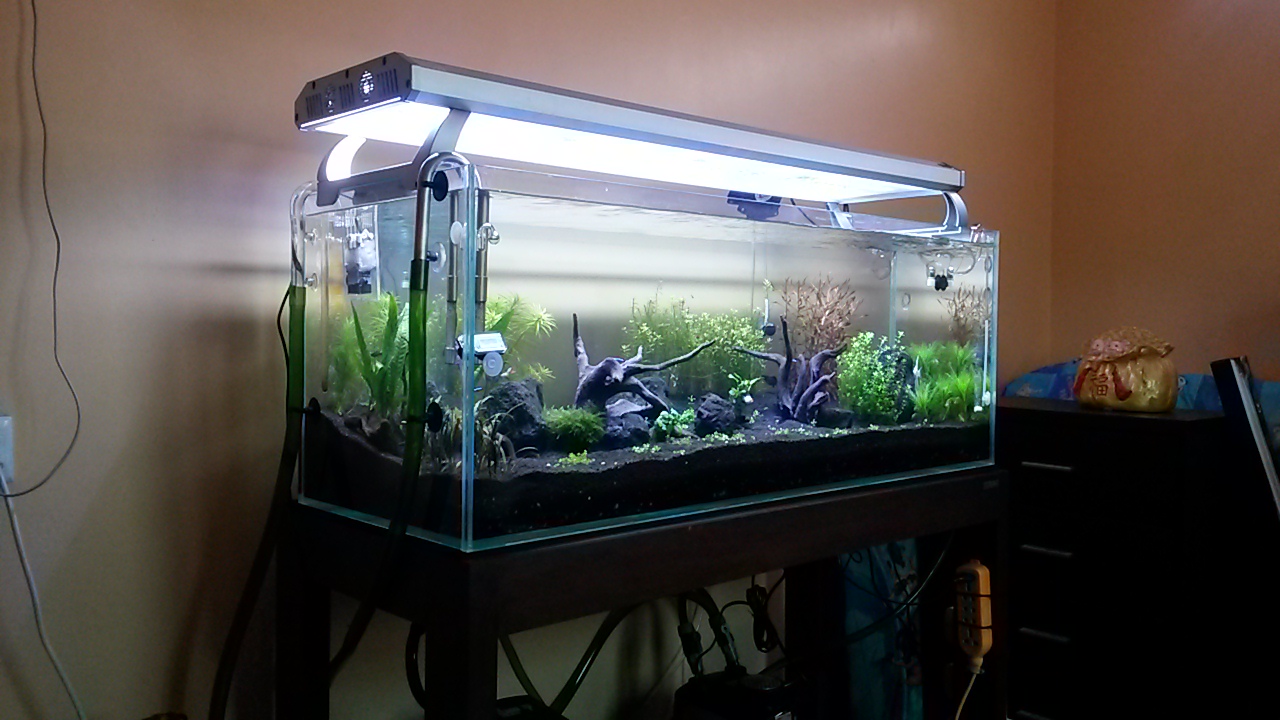 ตู้ 48" คำนวณปริมาณน้ำในตู้โดยหักดิน หักระดับน้ำขอบตู้ ได้ออกมา 155 ลิตร