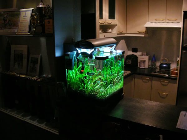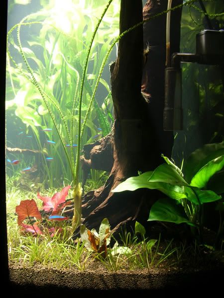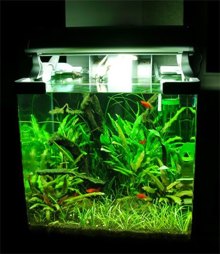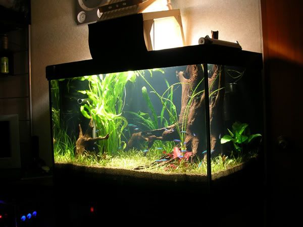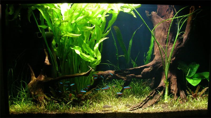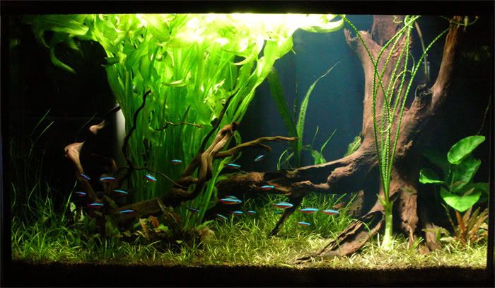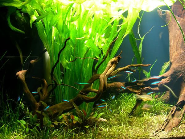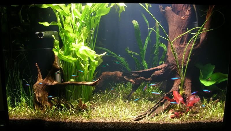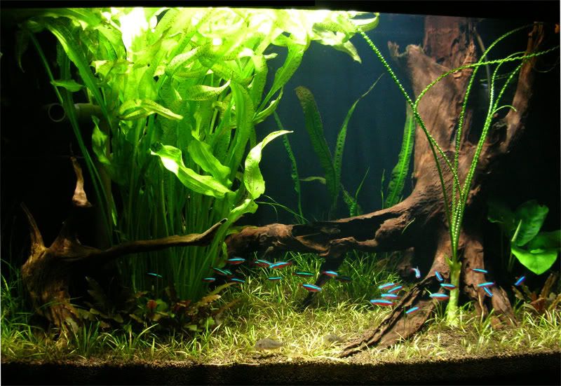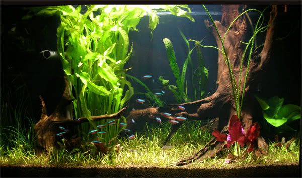 รื้อแล้วก็ยังคงแบบเดิมๆ เพราะดูแลง่ายดีประกอบกับไม่ต้องเสียตังค์ซื้อต้นไม้ใหม่ ไม้ก็มีแต่ไม้หัวล้วนๆ จะมี โอทีเรียของเก่าประมาณ 8-9 ต้น เทเนรุส จัดใหม่เพิ่มบัวแดงเข้ามาต้น แล้วต้นอะไรจำชื่อไม่ได้สีเขียวๆใบตะปุ่มตะป่ำด้านหลังครับ ส่วนปลาเน้นเป็นคารดินัลอย่างเดียวครับ