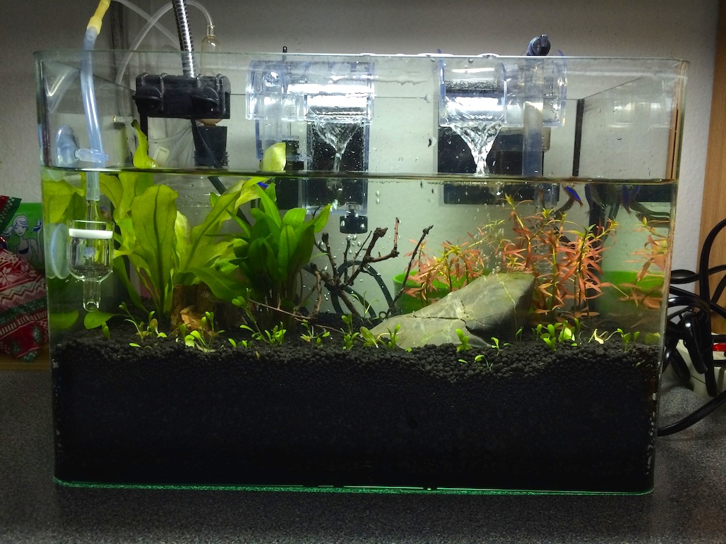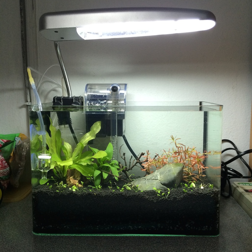 กะว่าให้เข้าที่เข้าทางก่อนแล้วค่อยหาปลามาลง แต่พอตื่นเช้ามาก็พบน้ำเจิ่งนองทั่วตู้ ตอนแรกคิดว่าตู้รั่วแน่เลย ดูไปดูมา ปรากฏว่าเป็นตัวกรองแขวนรั่ว วันนี้เลยกะเอาไปเปลี่ยนที่ร้าน ก็เลยถอดหิ้วมาที่ทำงานด้วย จนลืมเอาหัวดิฟ CO2 ออก มันก็พ่น ๆ ออกมาทั้งวัน