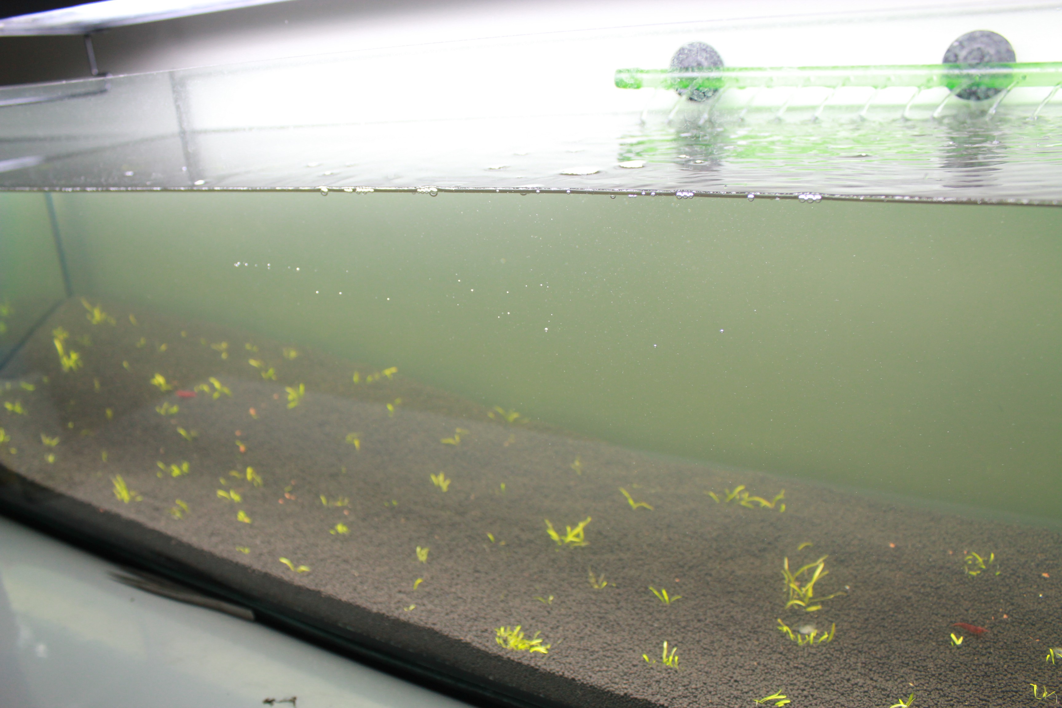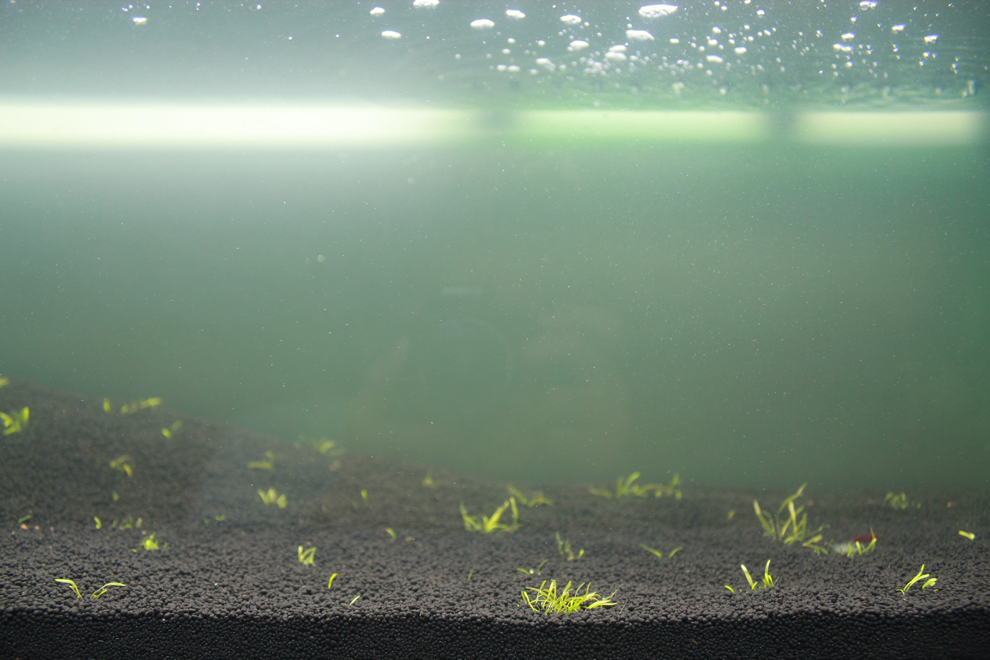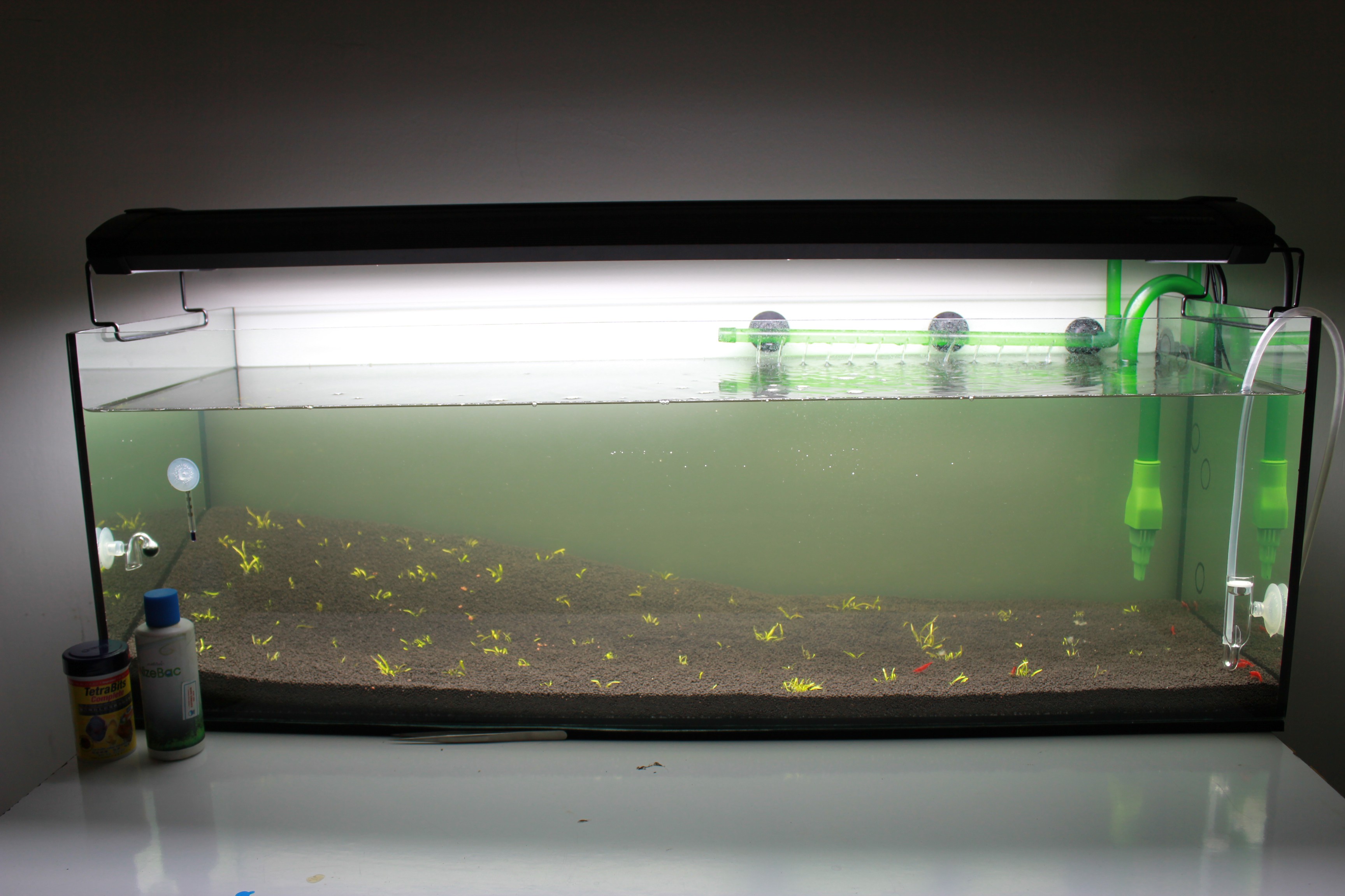 พอดีว่าพึ่งทำตู้มาได้สามวัน และนำไม้น้ำลงวันที่สอง คือ 4 เริ่มจัดตู้นำดินใส่ในตู้ จัดเรเอ้า แล้วก็ใส่น้ำเต็มตู้ ทิ้งไว้ 1 คืนเพื่อพักน้ำพร้อมเปิดกรอง หยดแบคทีเรีย ปกติ คาบอร์น 1 เม็ดต่อ 1 วิ อ่อลืมบอกแอบใส่ปลากับกุ้งลงไปแล้วด้วย 5555 วันที่ 5 นำ ต้นไม้น้ำลง ในดินที่เตรียมไว้ วันนี้แหละครับรู้สึกว่าน้ำขุ่น แต่ก็ไม่ได้คิดอะไร และทำการเปลี่ยนน้ำออก 30 % ออกจากตู้ และใส่น้ำกลับเข้าไปเหมือนเดิม โดยน้ำที่พักไว้ วันที่สามคือวันนี้ ก็ทำการเปลี่ยนน้ำ 30 % เหมือนเดิม ตอนหลังเปลี่ยนเริ่มใส และมีแนวโน้มที่ดี แต่เวลาปิดไฟเท่นั้นแหละ ผมสั่งเกตุได้ว่า น้ำเริ่มออกเขียวๆ ขุ่นๆ ซึ่งผิดปกติ เพราะทุกวันที่ผ่านมา ผมเปิดไฟทั้งหมด 4 หลอดพร้อมกัน เป็นเวลา 8 ชม. อันนี้อาจจะทำให้เกิดตระใคร้ก็เป้นไปได้ น้ำเลยออกสีเขียวๆ (เดาเอาครับ)