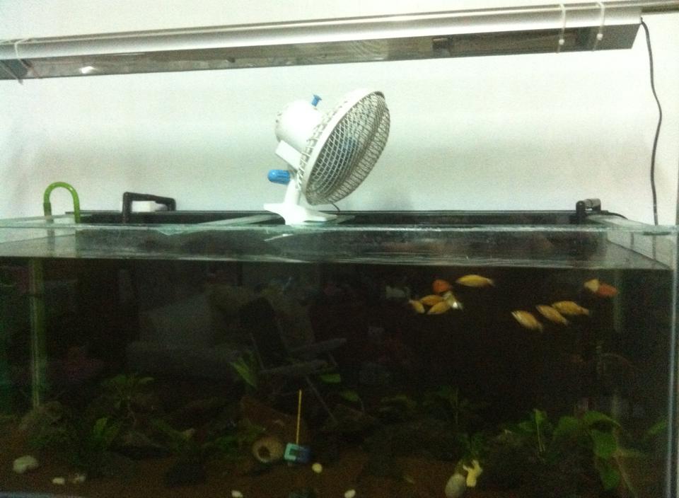 เอาพัดลมตัวนี้มาเป่าก่อนครับ ตอนนี้อุนหภูมิลดลงบ้างแล้วตอนนี้อยู่ที่28.8(ตัววัดดิจิตอล -..-) รากดำจาก10กว่าต้นตอนนี้ดึงออกไปแช่ในอ่างบัวนอกบ้านเเล้วครับลองใส่กากน้ำตาล+น้ำEMลงไปด้วย 5  5+