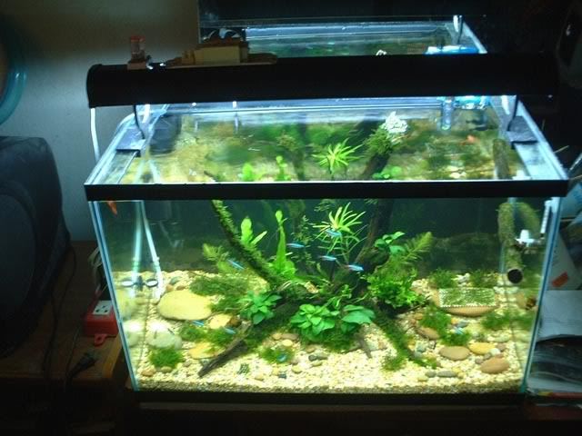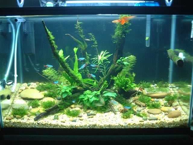 สวยดีครับ ตู้แรกของผมยังไม่ได้ขนาดนี้เลย ของผมผ่านไป 1 สัปดาห์ ใบเริ่มเหลือง หลุด กระจายเต็มตู้เลย  ถือว่าเริ่มต้นได้ดีเลยครับ ถ้าให้แนะนำอีกนิด เพิ่มไฟแบบเดิมอีก1 โคมจะดีเลยครับ เผื่อไว้สำหรับไม้ที่ต้องการแสงเยอะหน่อย เท่าที่เห็นจะมีไม้ข้ออยู่ก้านนึง  ไม่งั้นมันจะเหลือง