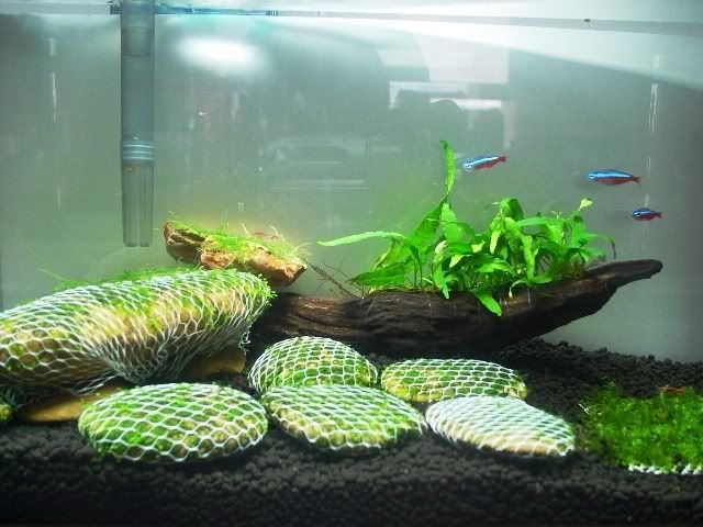 ต้นเทปแคบมันจะแทงลากไหลไปตามได้พื้น ตรงไหนที่เราไม่อยากให้มันขึ้นแล้วมันขึ้นมาก็ตัดทิ้งครับ  ส่วนขอนไม้ถ้าไม่อะไรมากแนะนำว่าเอาออกมาพันใหม่เลยครับ ไม่มีคำว่าสวยเกินไปสำหรับตู้ไม้น้ำครับ  เอาออกมาแล้ววางสไปกี้มอสที่ละใบเรียงๆกันไปตามแนวขอนแล้วใช้เอ็นพันไม่ต้องถี่มากนะครับ เอาแค่เกือบๆถี่  พันแน่ๆมันจะแตกยอดอ่อนออกมาในระยะเวลาไม่นานครับ  ขอนไม้ก็จะกลายเป็นขอนสไปกี้ ไฟถึง คาร์บอนถึง น้ำเย็น  ไม่นานท่วมตู้ครับ ้hahaha ลองดูครับ [เย้ะ]