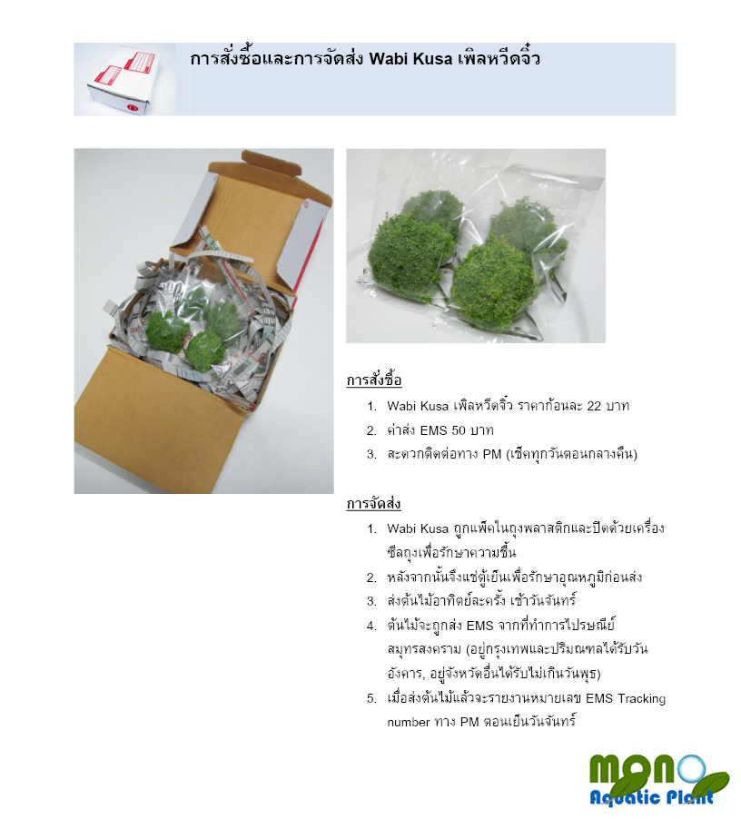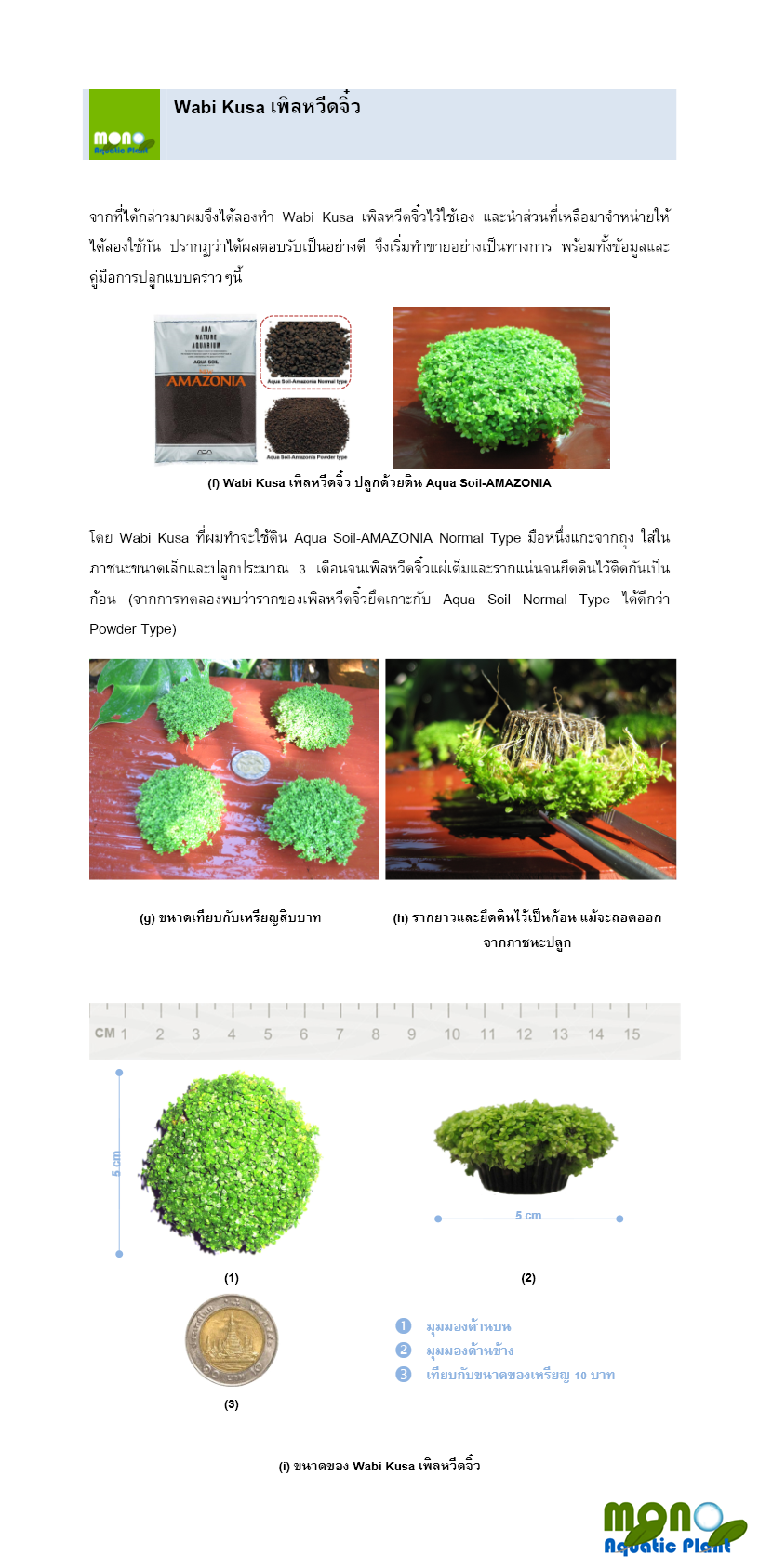 ปลายปีที่แล้วผมได้ลองทำ Wabi Kusa เพิลหวีดจิ๋วไว้ใช้เอง และนำส่วนที่เหลือมาจำหน่ายให้ได้ลองใช้กัน ปรากฏว่าได้ผลตอบรับเป็นอย่างดี จึงเริ่มทำขายอย่างเป็นทางการ พร้อมทั้งข้อมูลและคู่มือการปลูกแบบคร่าวๆดังนี้ สนใจสั่งได้ทาง PM