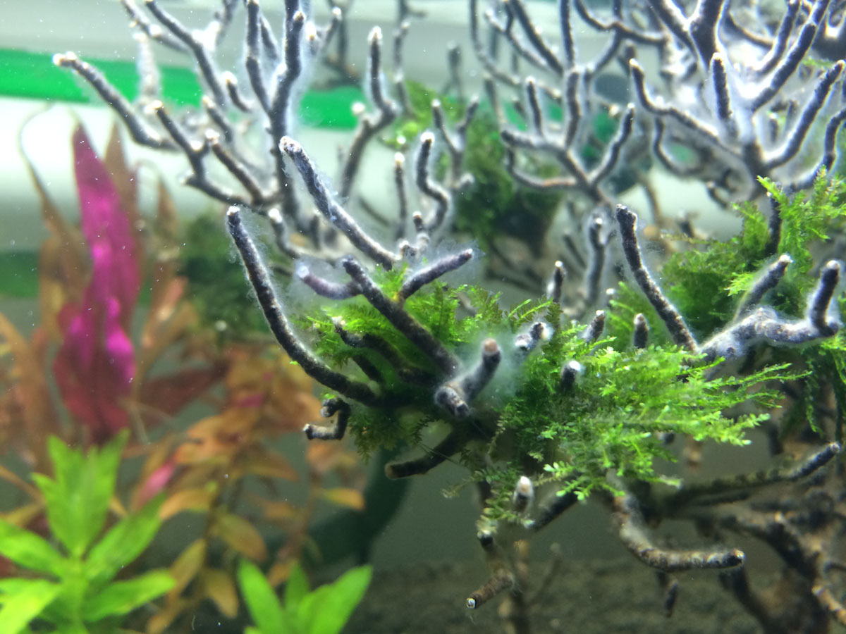 กิ่งไม้ มันมีอะไรคล้ายๆ ขนขาวๆ เกาะทั่วเต็มไปหมด พอดีผมเอาฟองน้ำถูออก มันเหมือนเป็นเมือกๆ อ่ะครับ