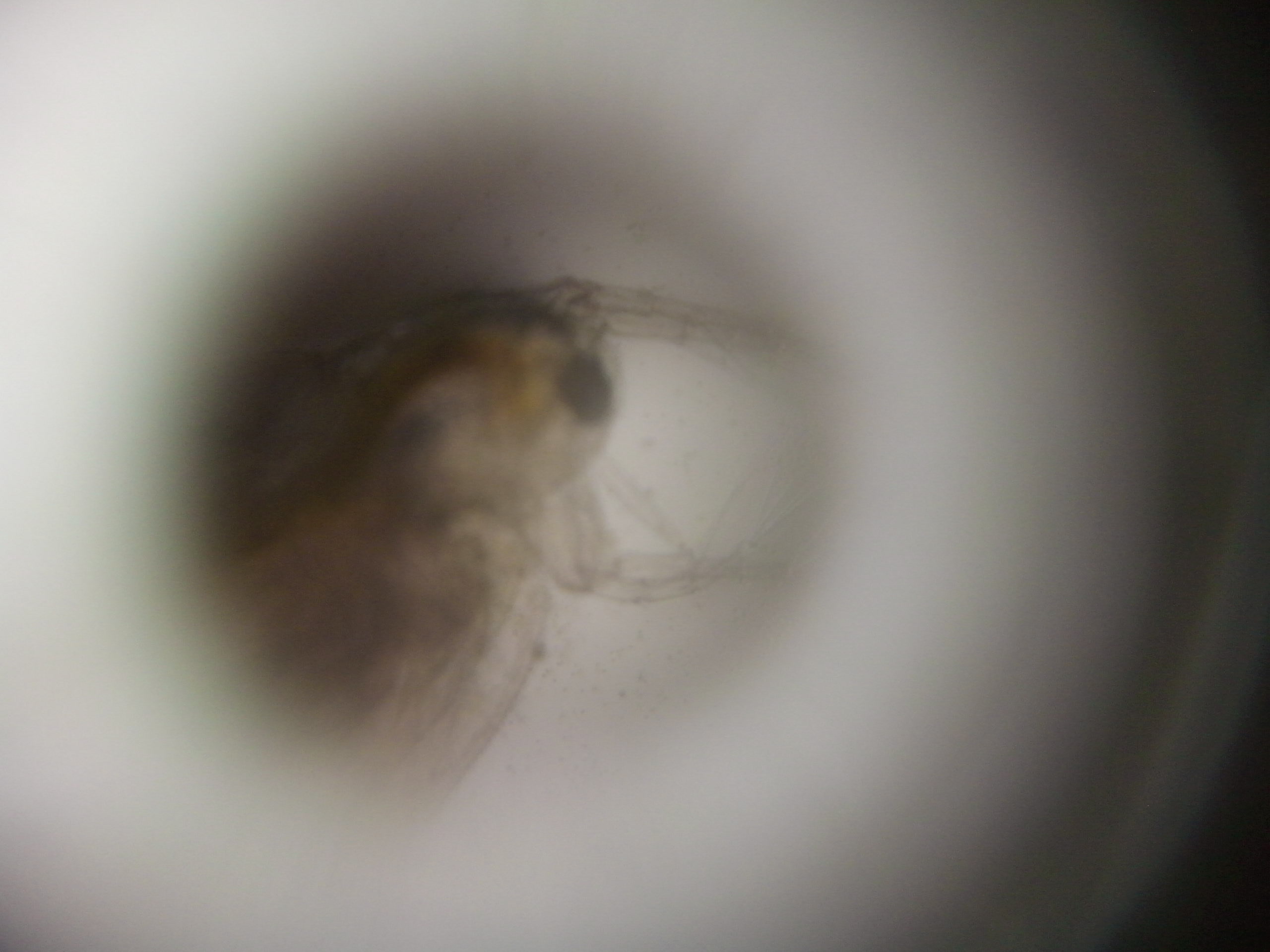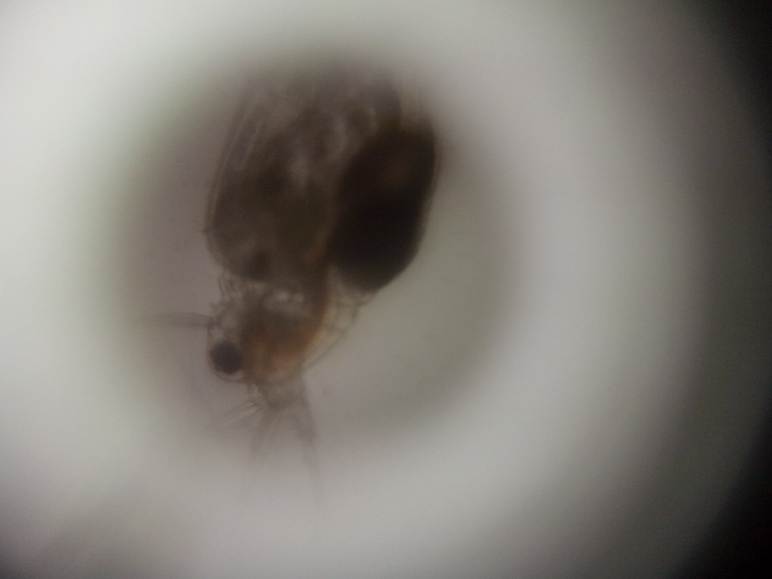 ตัวอย่างถ่ายไรแดงจากเลนส์กำลังขยาย 100X จะสังเหตุเห็นจุดทึบแสงที่หลังของไรแดง คือ ไข่พักของไรแดง