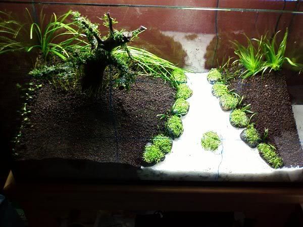 8. เติมน้ำสักหน่อยให้พอถ่วมดิน แล้วก็ปักกลอสโซ่เป็นแนวรอมันเลื้อยเลยครับ พอเสร็จก็เติมน้ำจนเต็มแล้วเปิดอุปกรณ์ให้ครบ เสร็จตู้นี้ ตอน ตี 3 ครับ เหนื่อยโคดเลย ตอนปักกลอสโซ่นี่แหระ ตอนแรกกะจะปักติดเลยครับ แต่ไม่ไหวจะตายให้ได้