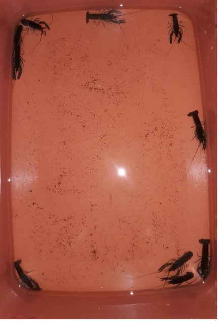 ขนาด 2" จำนวน11 ตัว ผู้ 6 ตัว เมีย 5 ตัว มีก้ามขาดและไม่เท่าประมาณ 4 ตัว (แต่ลอกคราบแล้วจะขึ้นใหม่) เลี้ยงน้ำประปา