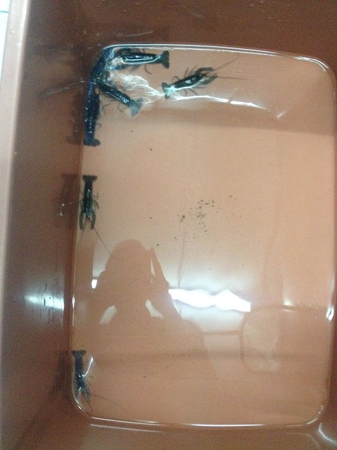 ขนาด 2"++ และ 3" จำนวน 7 ตัว ผู้ 4 ตัว เมีย 3 ตัว มีก้ามขาดและไม่เท่าประมาณ 2 ตัว (แต่ลอกคราบแล้วจะขึ้นใหม่) เลี้ยงน้ำประปา