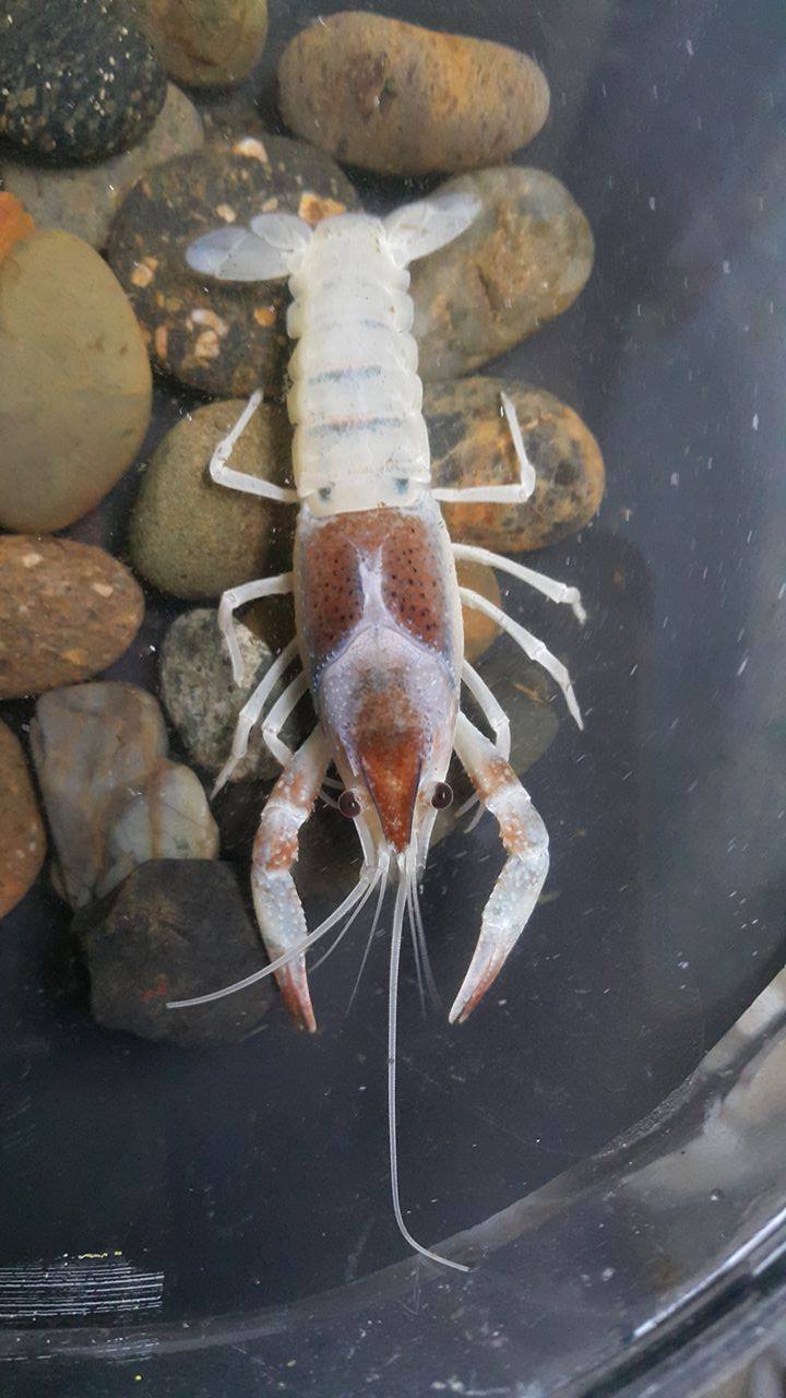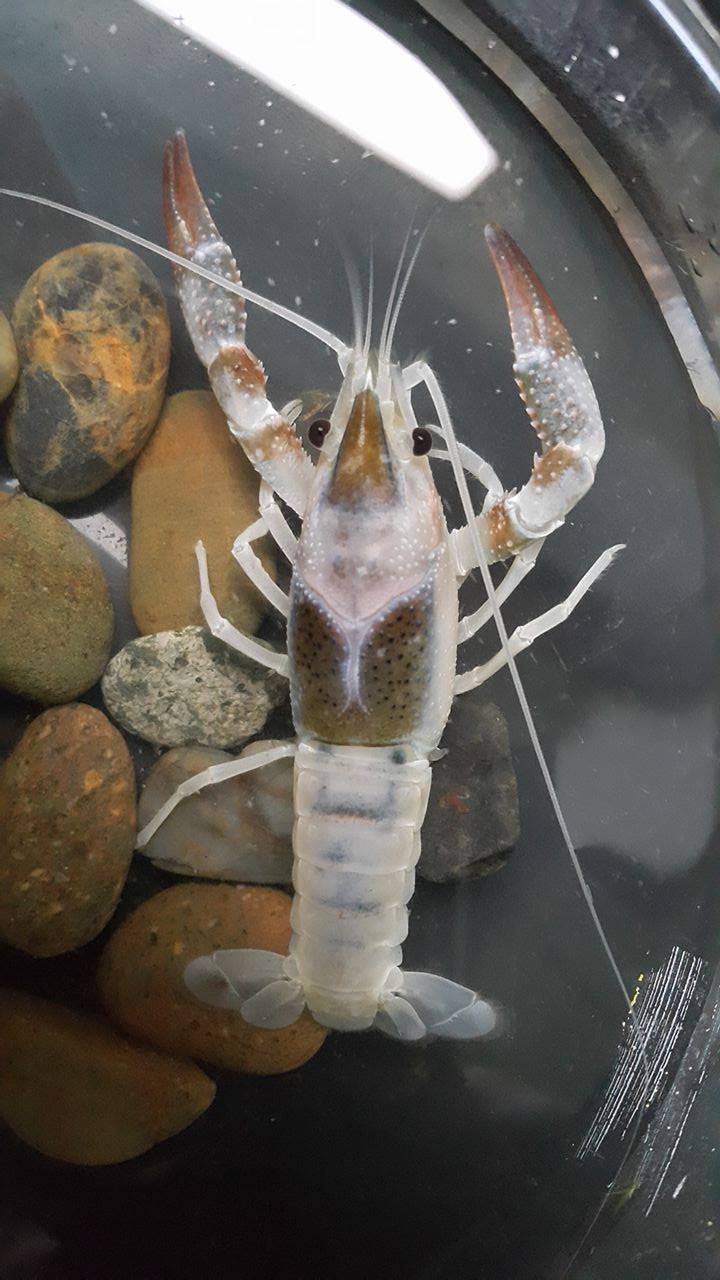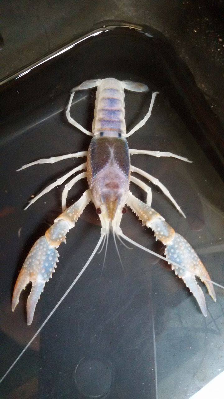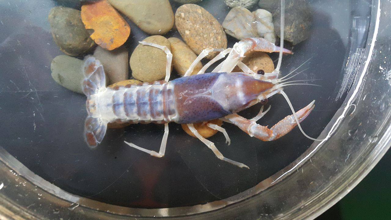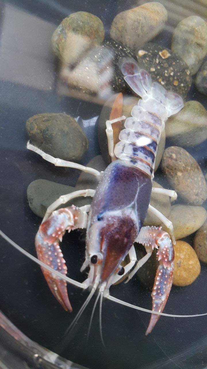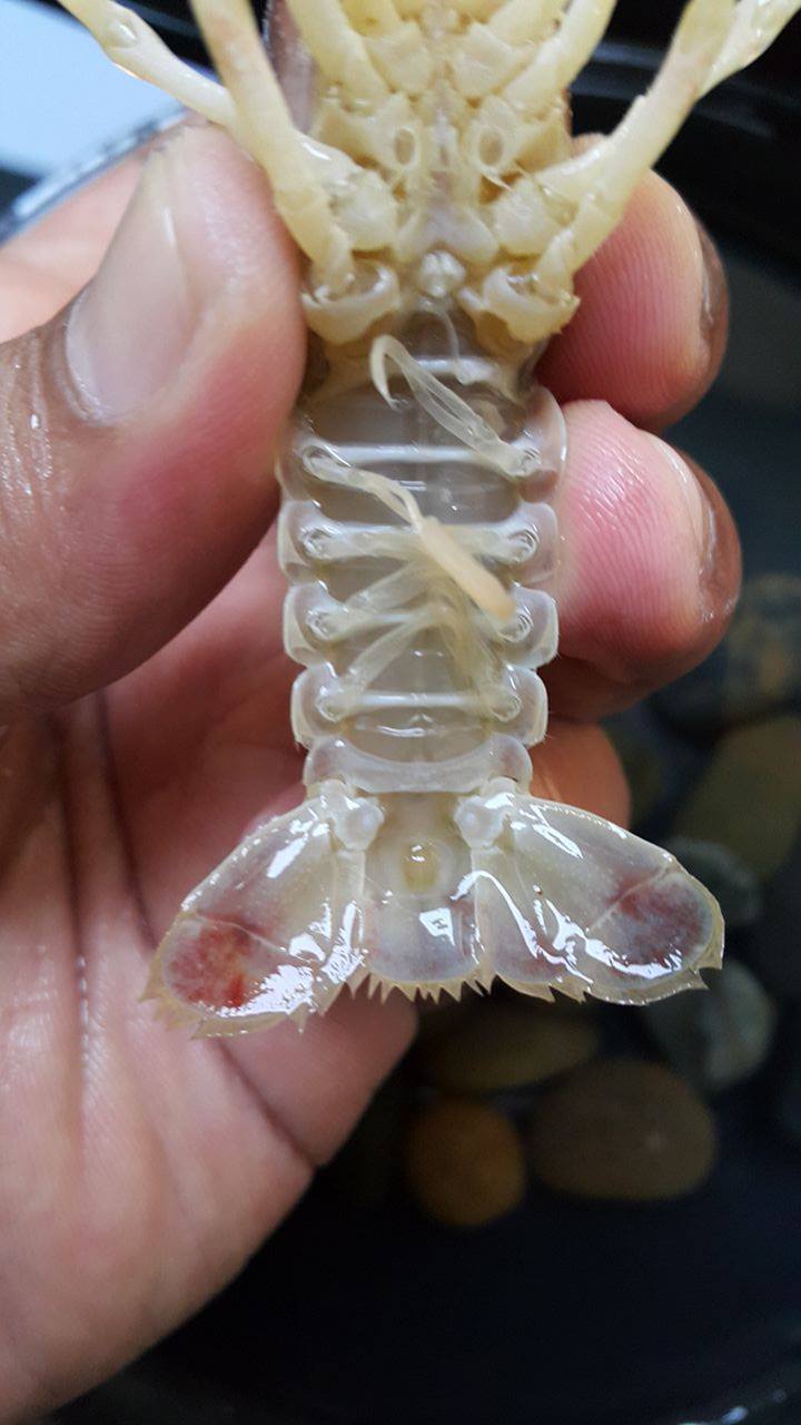 M6  โกสแท้ เพศผู้ ขนาด 2.6" หัวด่างๆ หลังสีน้ำตาล ก้ามสีแดง  หาง5ดอก ขาเท่า หนวดเท่า