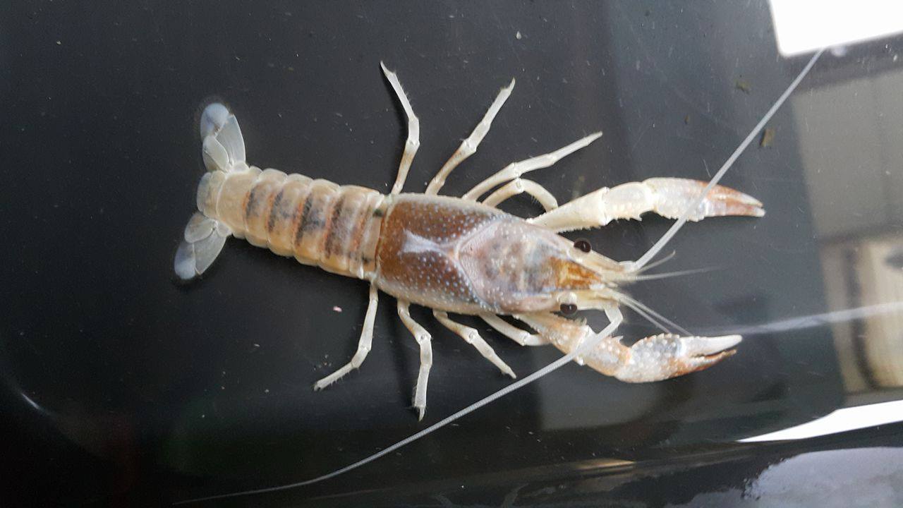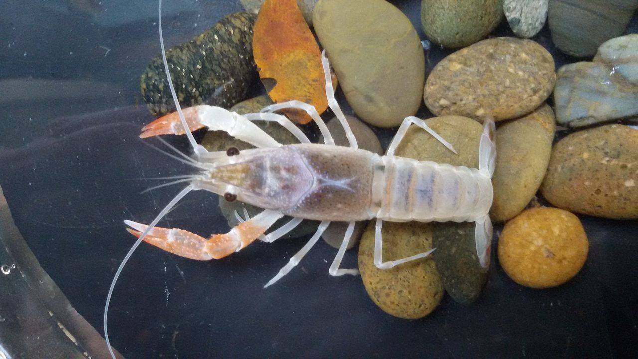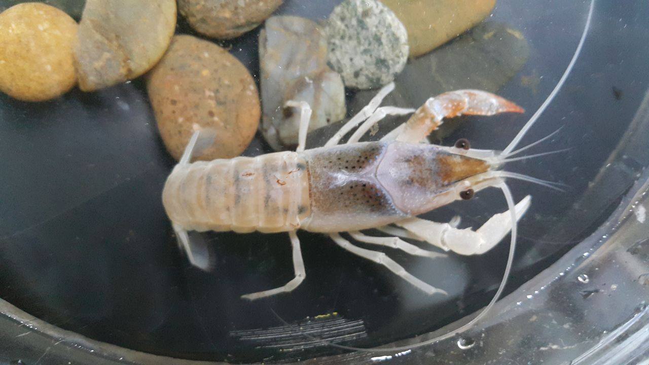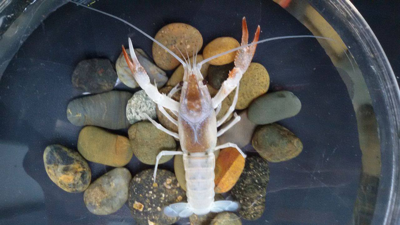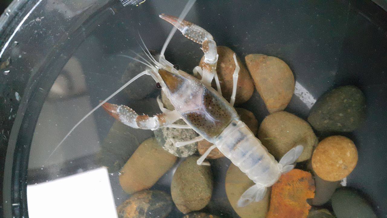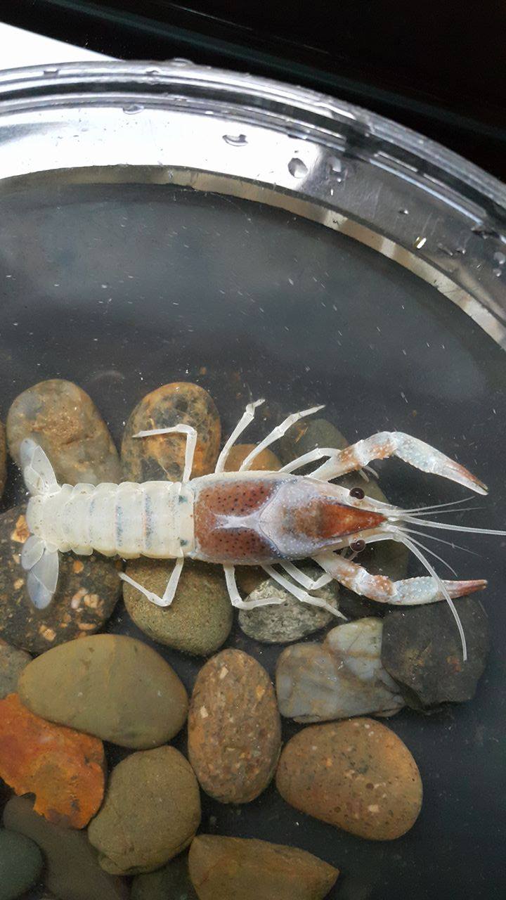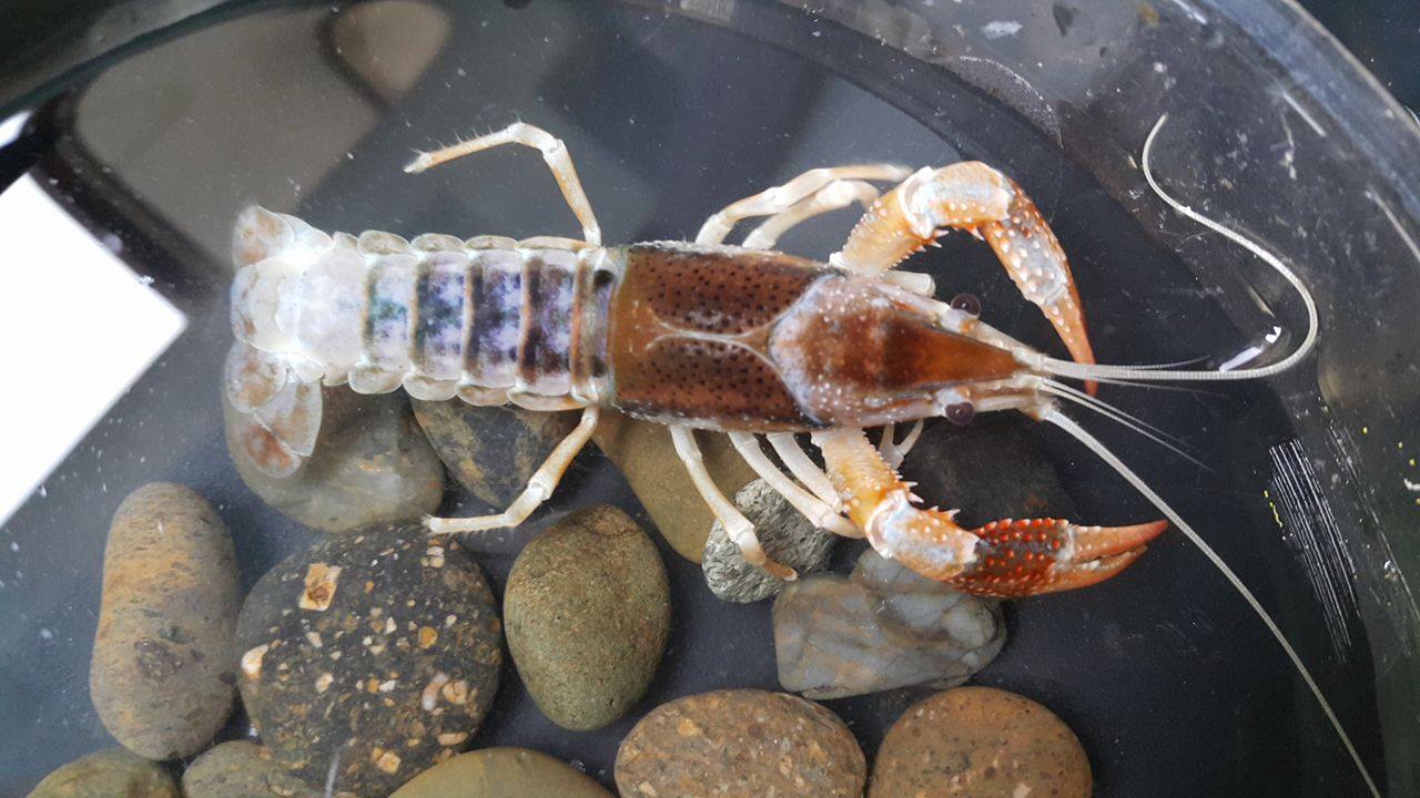 M6  โกสแท้ เพศผู้ ขนาด 2.6" หัวด่างๆ หลังสีน้ำตาล ก้ามสีแดง  หาง5ดอก ขาเท่า หนวดเท่า
